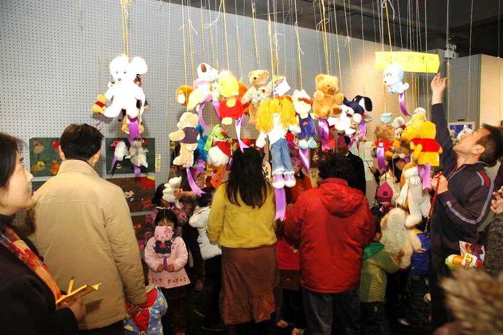 捐赠玩偶区——为灾区儿童捐赠自己心爱的玩偶活动。将带来捐赠的玩偶和祝愿语一并悬挂在展厅。一个玩偶,一条飘带,一颗心,一句话,爱心传递,传递了美好的愿望和祝愿,留住了关爱和纯洁的心灵。