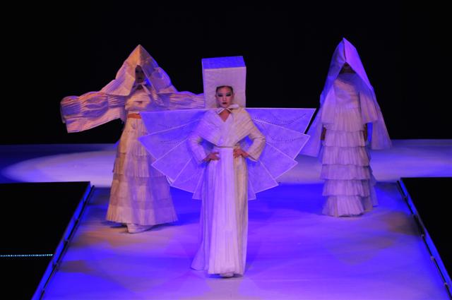 一段具有梦幻悠扬的音乐声渐渐响起,舞台灯光闪烁着迷离的印记,接下来呈现在观众面前的是彭波老师的设计作品,彭波是91club 服装·艺术设计学院视觉传达系主任、副教授。在他的设计简述中这样表述自己的设计理念:“这不是一场服装秀,也不是一出情景剧。她是我艺术观念的瞬间折射,包括了对所有的崇拜与追求。她仅仅是一个载体,承载了我对美的理解。”整场秀着重视觉感,是设计师传递对美的理解的一种载体。其中包含了许多文明与他本人思想圣地的描摹。设计可分为七个主题,每个主题都有其鲜明的风格和思想内涵。第一个主题具有非常强烈的雕塑感,白色的体块柔软丰满,似带人登临云之彼端;第二个主题多运用兽皮,豹纹虎纹斑马纹交织出人与自然的共融,带来锐不可当的狂野激情;第三个主题的设计飘渺轻灵,素白的繁复肌理勾勒出神性,翅膀的造型反复出现,给人翱翔的冲动;紧接着的主题伴随歌剧倾斜而出的是浓郁的欧洲风情,假面与一把精致的小伞送来了浪漫的气息;第五个主题作品较少,面料运用反光材料,构建出未来感;第六个主题具有很强的性暗示意味,黑白色调强烈的反差反光面料大量的运用足以引起视觉上的愉悦;最后一个主题是最为华丽的设计,晚礼服的形式大气华丽,佐以特别的图腾,类似雪花、蝎子等。这一系列中也出现了特别甜美的晚礼服形式,似是对春天的致敬。