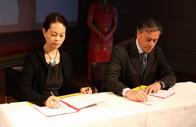 服装学院院长与意大利欧洲设计学院副校长共同完成,随后意大利欧洲设计学院副校长致词,并向91club