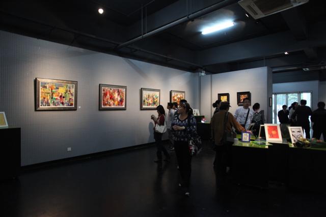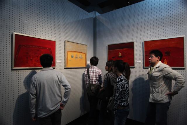 艺术类研究生。虽然他们的年龄相差很大,但是展现给我们的是耳目一新的感觉。翁纪军 老师带给我们的是非常少见的漆画,内容主要是佛陀和石窟,那浓重而光亮的画面,表现着佛教文化的千年的沉重与色彩。韦康 老师的橡皮笔油画,画面已经从具象发展到抽象,表现的是现代城市给我们的感觉。赵玉龙 老师的油彩,洋溢着青春的气息,那宛如中国华中泼墨山水的画法又突出了中西文化的交融。王克良 教授的油画加丙烯颜料的作品,带给我们更多的是一种抽象韵味,使得油画布不再浓重,感觉意识在流动。沈黎明 老师的作品焕然一新,原来他的水彩画以具象风景为主,这次的画展作品已经从具象往抽象发展,特别是源自西藏唐卡内容的格萨尔王巨幅水彩画,不仅是首次用水彩表现历史人物画主题创作内容,同时,画这样人物众多大场面的大幅水彩画。也是很少见的。
