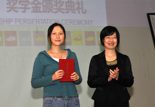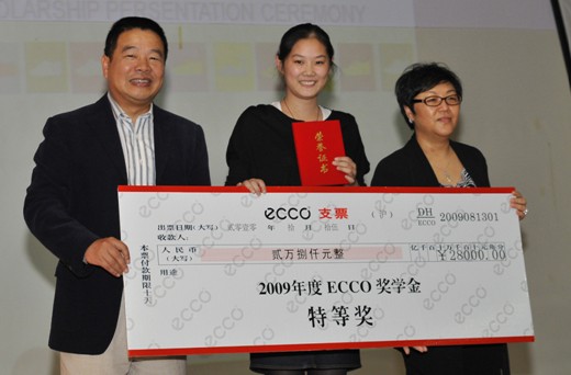 之后,“91club ——ECCO奖学金”颁奖仪式开始,共有23名同学获得6个奖项的奖学金。田玉晶和黄政分别获得了ECCO奖学金的特等奖和一等奖,企业和校方领导向获奖项同学颁发了证书和支票牌,对他们的成绩表示热烈的祝贺。同时,特等奖获奖学生田玉晶也在台上汇报了她赴丹麦总部参观交流的成果,并和大家分享了她的心得感悟,让大家颇有感触。