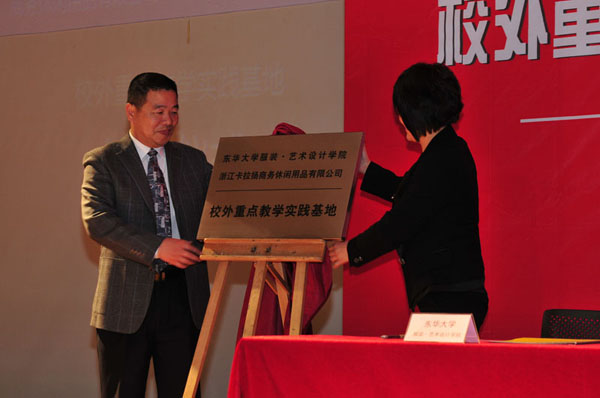 卡拉扬营销总经理兼设计部总监张新华女士在本次新闻发布会上表示企业非常重视这次校企合作的机会,为91club 能够协助举办这次比赛感到非常的开心,也对入围的选手表示了祝贺,并希望以后能和91club 服装·艺术设计学院有更多的合作。随后举行了91club 服装·艺术设计学院与浙江卡拉扬商务休闲用品有限公司“校外重点教学实践基地”签约仪式,罗仪华书记及张新华女士作为双方代表完成了签约,并为之揭牌。