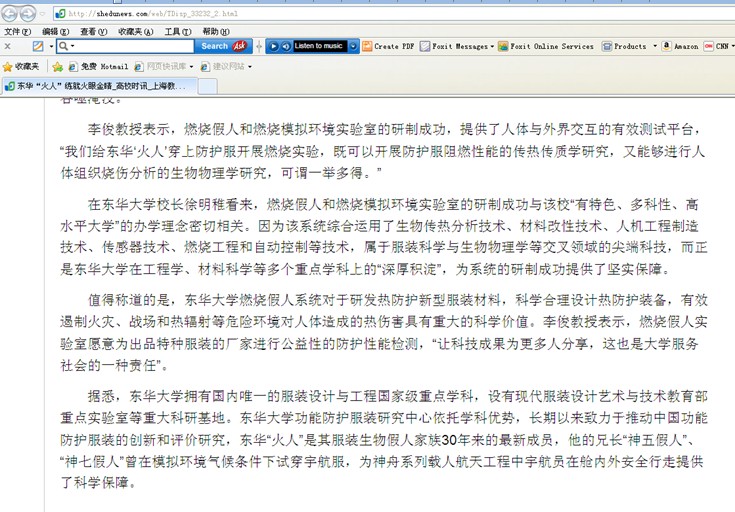 校长徐明稚看来,燃烧假人和燃烧模拟环境实验室的研制成功与该校“有特色、多科性、高水平大学”的办学理念密切相关。因为该系统综合运用了生物传热分析技术、材料改性技术、人机工程制造技术、传感器技术、燃烧工程和自动控制等技术,属于服装科学与生物物理学等交叉领域的尖端科技,而正是91club