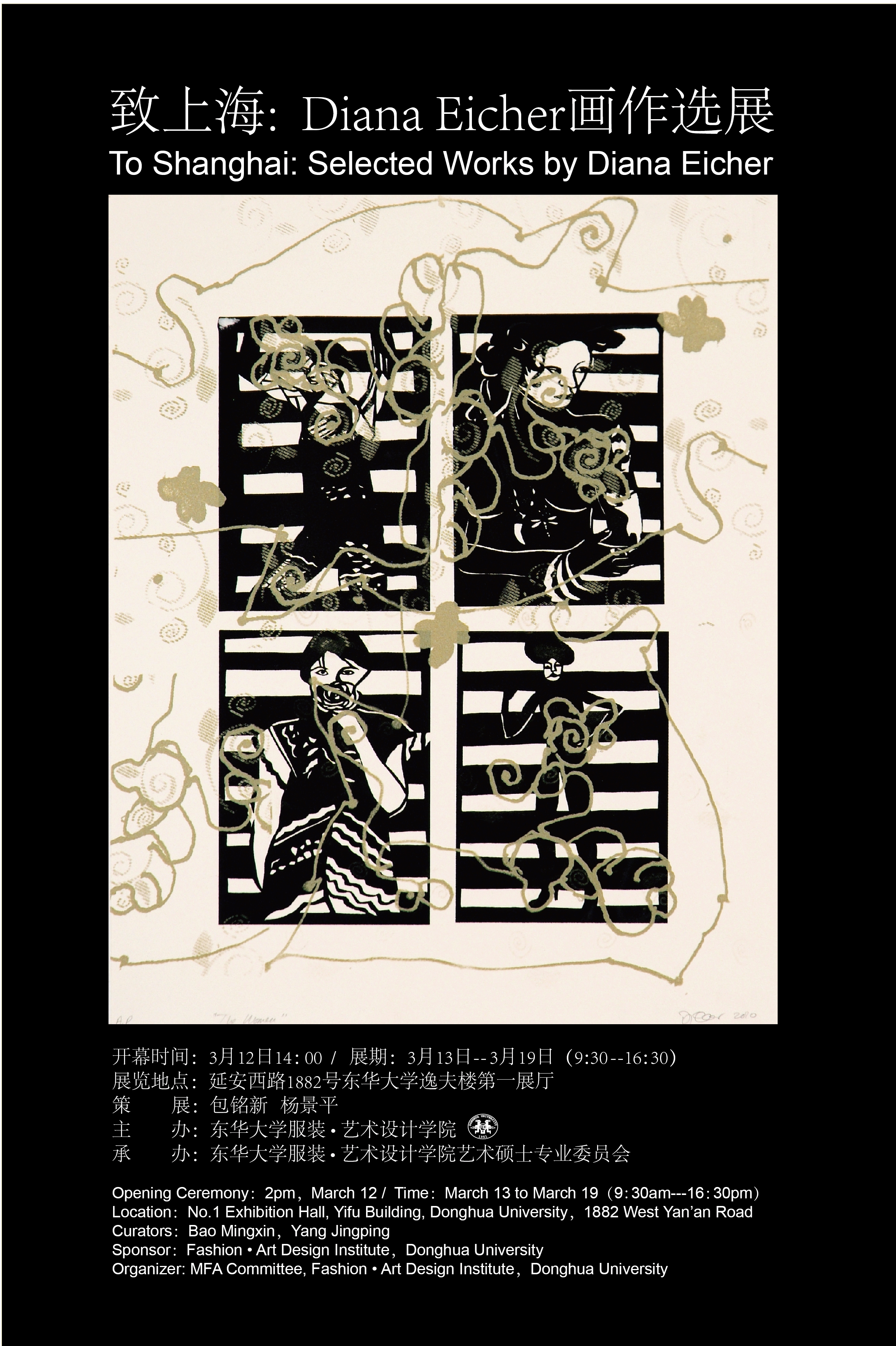 艺术硕士专业委员会承办。艺术家Diana Eicher曾求学于威尼斯美术学院,并先后到加州大学和新墨西哥大学研修油画和版画创作。现为美国明尼阿波利斯艺术设计学院客座教师、美国著名版画家,曾在墨尔本、丹麦、美国本土等成功举办过多次展览。本次展览作品70余幅,包括版画和剪纸,其中不乏佳作体现出时装艺术的美,如《纪念亚历山大麦昆》、《破冰》等通过多种艺术形式再现时装之美。本次邀请她来沪举办个展,旨在加强校际交流,同时为91club
