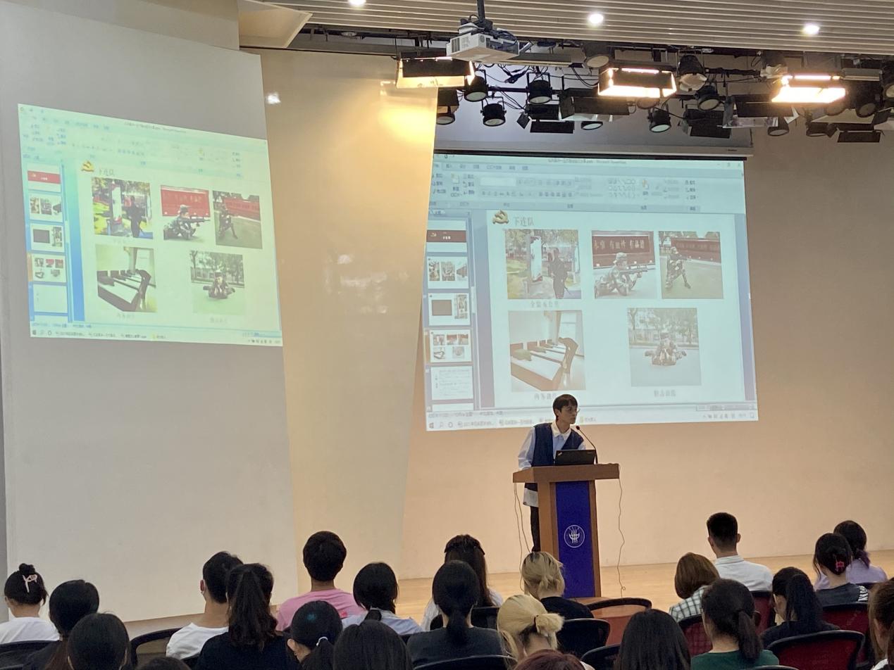 来自环境设计专业2001班的退伍老兵张疏峒向我们讲述了军人的职责,在战乱纷飞的峥嵘岁月里,他们舍生忘死、奋勇杀敌;在和平年代里,他们默默奉献,与钢枪为友,与星辰作伴。从事着最危险的职业,因为这份职业可能会以牺牲生命为代价,但为了祖国与人民,挺身而出,无怨无悔,只因为他们是中国军人。他呼吁在座的同学们:“无论从事什么职业,请大家心里和军人一样,永远记着我们的国家、民族,在努力追求个人兴趣追求的同时,为中华民族伟大复兴的强国梦贡献力量。”