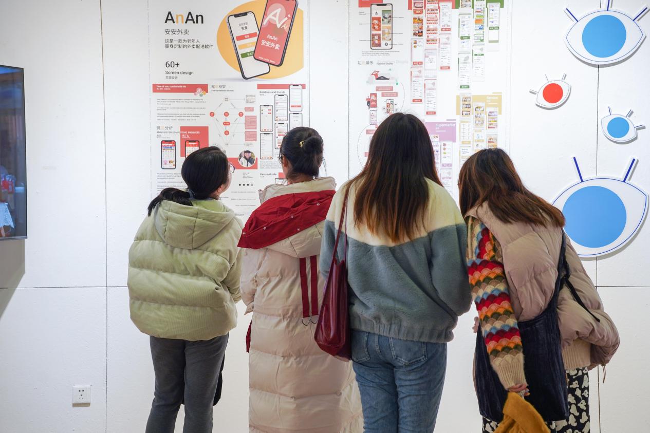 第二部分是社会实践及创新创业优秀成果展,展示了学院近三年来的社会实践和创新创业成果。学院团委通过“衣食住行乐”五大板块,展示了近三年优秀实践团队的项目成果,通过各团队的实践vlog、媒体采访报道视频、实际成果产出、暑期社会实践材料汇编等多种形式和不同视角展现学院在社会实践方面融合学科发展、服务人才培养取得的优秀成绩。三年来,学院共组织社会实践项目117支,其中转化为双创比赛项目43个,共获“挑战杯”国家级三等奖1项,“互联网+”上海市银奖2项、铜奖3项,“知行杯”上海市特等奖1项、三等奖4项。经过多年探索,学院围绕非遗传承、城市发展、乡村振兴、可持续环保等方面探索设计介入的新模式,取得了优异成绩。展览最后,青年志愿者协会和科学商店分别展示了特色项目“牵手艺术彩虹,共创美好生活”、“非遗工作坊”的特色成果,展现了学院在长宁区探索“环东华”美育志愿服务平台的建设成效。