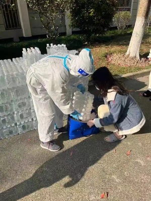 4月3日,首批捐赠矿泉水由教师志愿者发送至延安路校区6000余名大学生手中,每人10瓶。在学校防疫工作亟需援助之际,校友师生们的爱心如同涌泉汇聚母校,这份速度与情谊,令师生们感动不已。