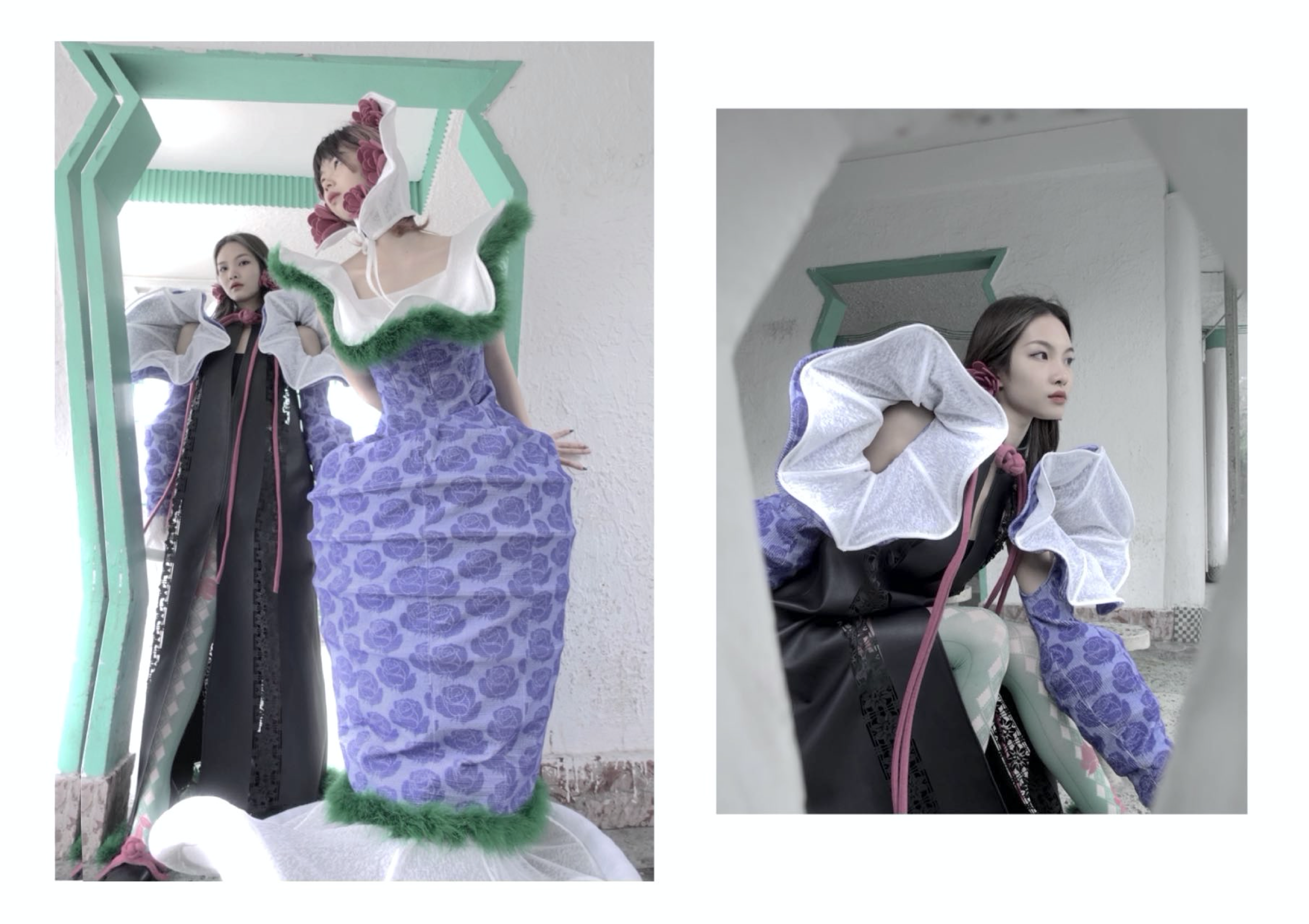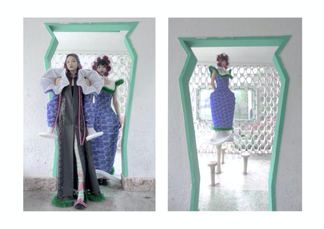 曾紫绮的作品灵感来源于中国传统文化中的纸作文化。纸作是中国人生活世界中的物质精神。人们将亲情、友情、爱情等寄托在一个个精美的纸作上,是为逝去亲人、友人、爱人寄出的一封信,世间每一个纸作都承载着一个不一样的故事。人们用最精美、最艳丽的纸作传递着内心深处最浓厚、最想表达的情感。服装最大的亮点在于大胆运用色彩的搭配和中式花瓶在服装造型上的变形。这个将传统文化技艺与服装的创新结合得到评委老师的好评。