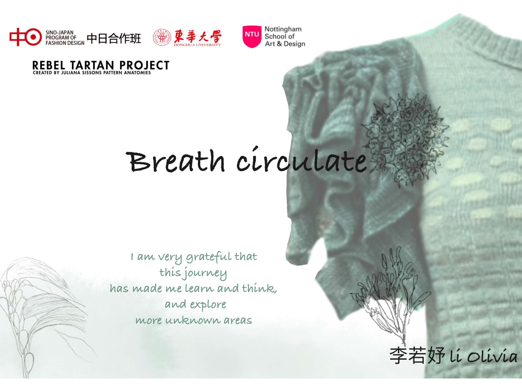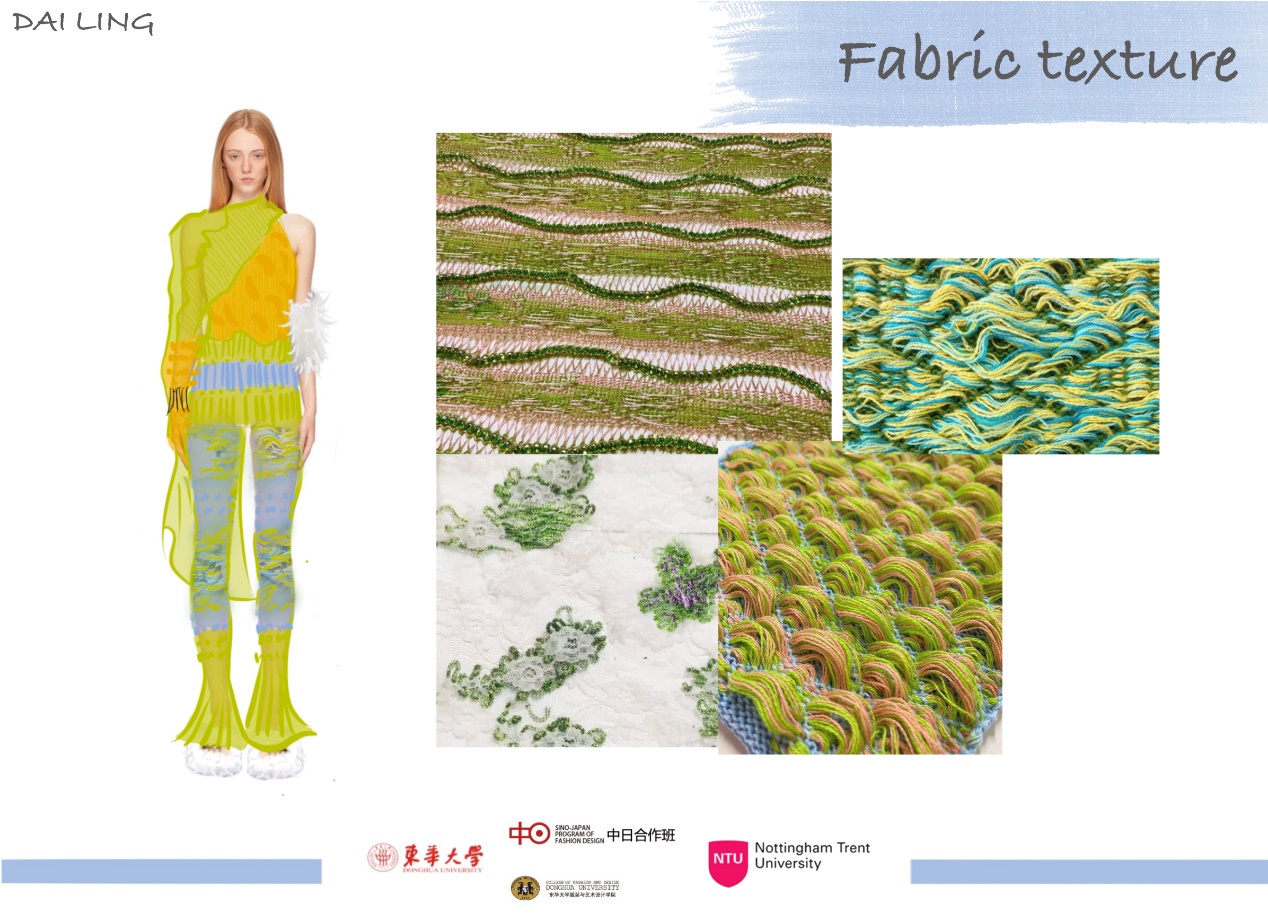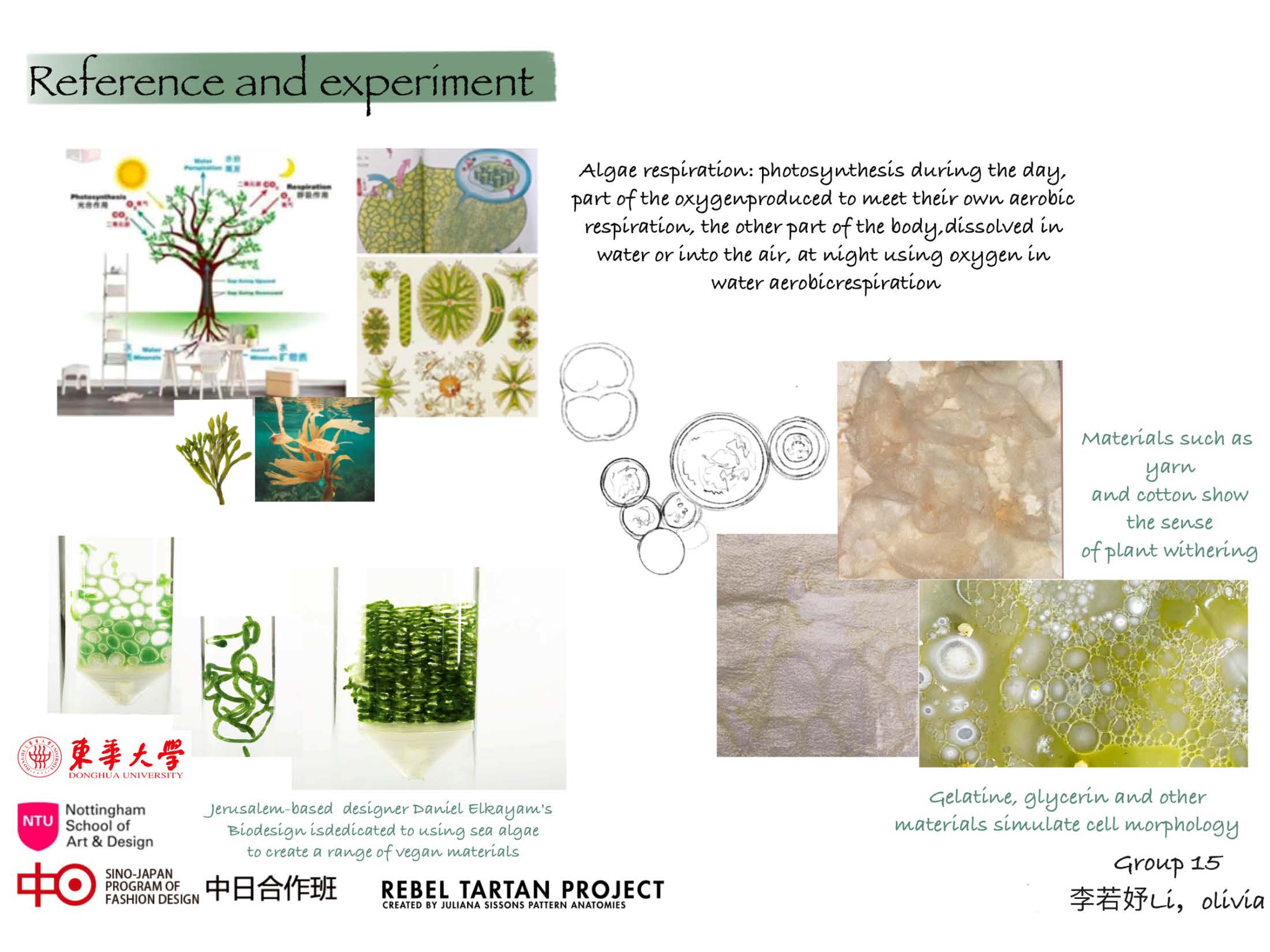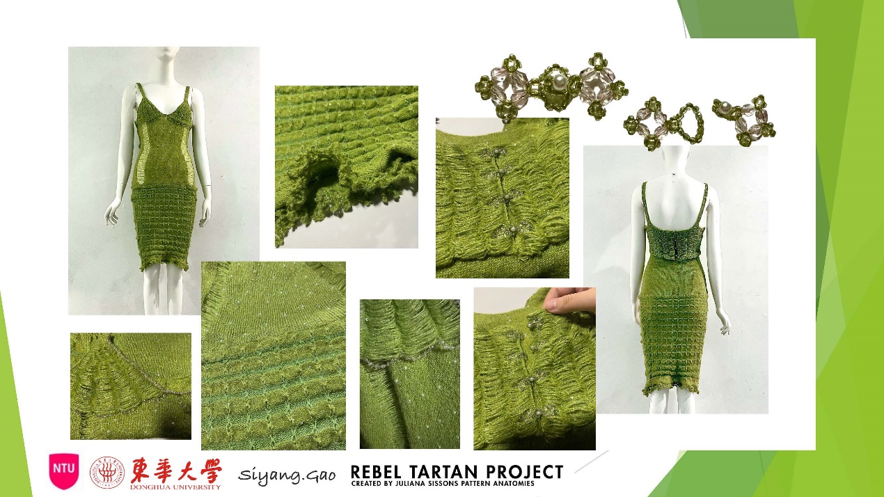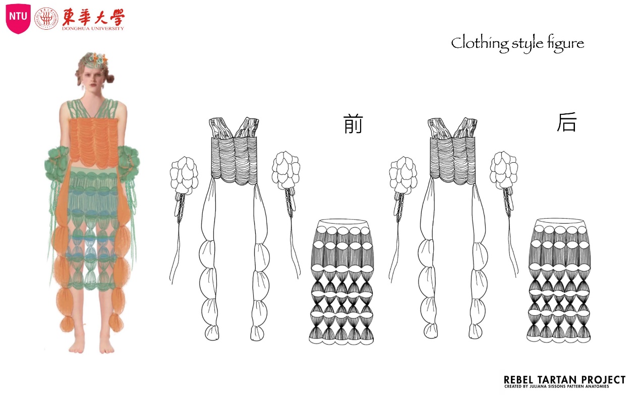作品理念:通过绿色植物来研究植物呼吸之间的循环关系。本次的具体研究对象为海藻,提取海藻生长期、发育期、死亡期三个生长阶段的色彩,提取不同海藻细胞的形态肌理,主要采用网状结构、木耳边结构、挑洞结构、浮线结构、抽褶结构等来模拟海藻生长状态以及细胞形态,希望通过展现植物的呼吸循环,有利于碳中和,进而呼吁环保与可持续发展。