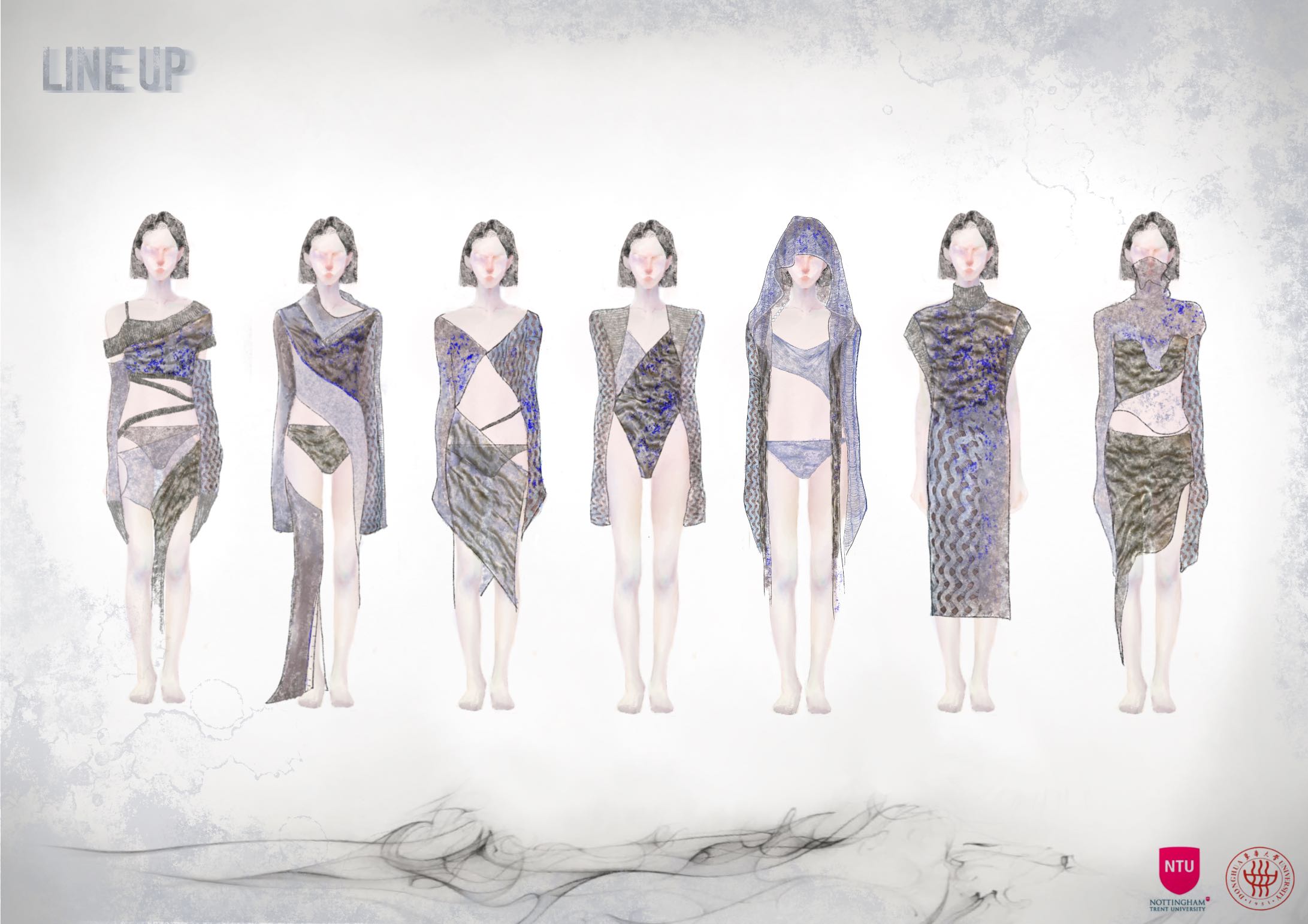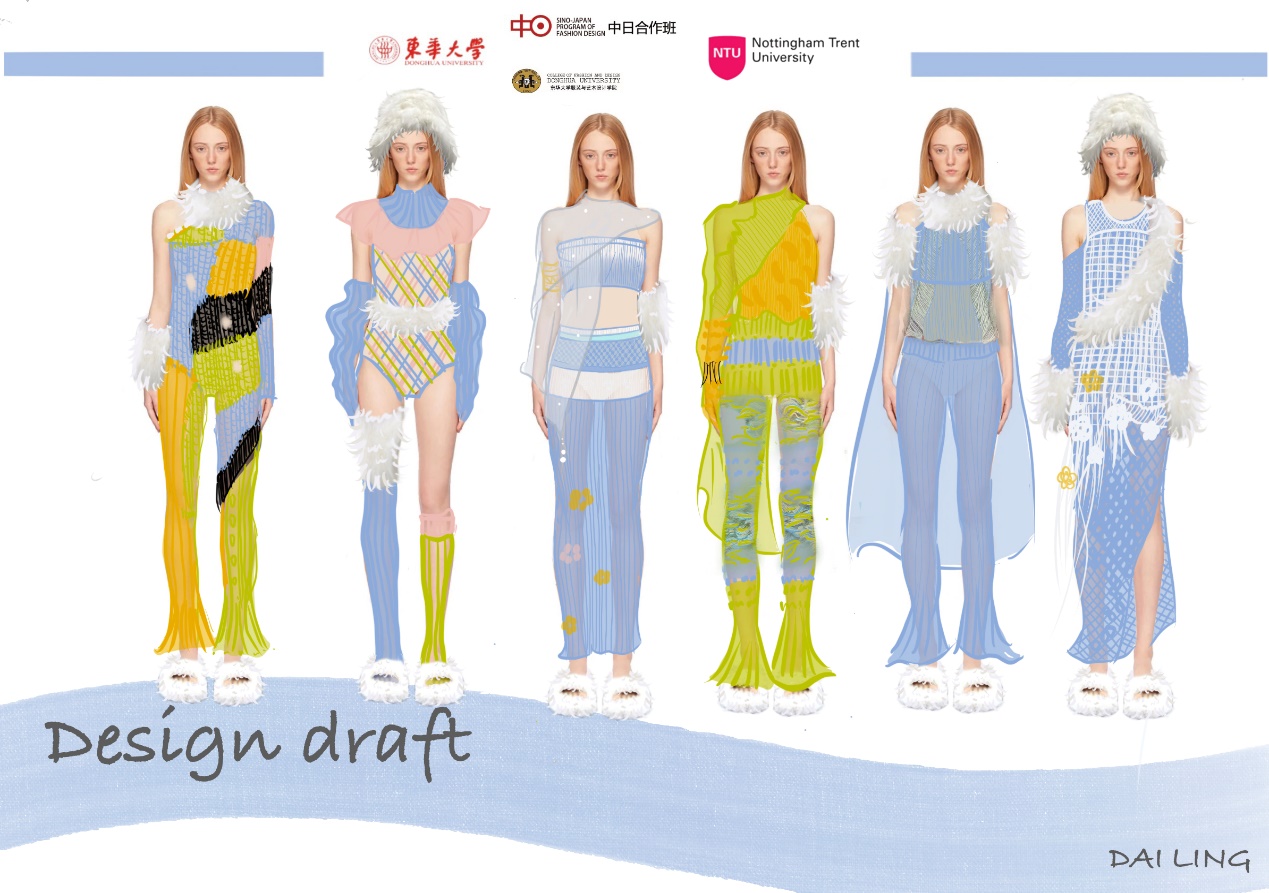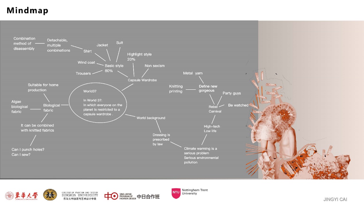 作品理念:基于气候变化和可持续设计,希望使用天然纤维或生物面料来替代合成和化学生产的材料,以减少对环境的有害影响。我们团队创建的37号虚拟世界里,每个人只有一个被限制的胶囊衣服。使用环保生物塑料材质为人们的衣橱增添色彩和乐趣,同时降低污染。我个人的设计则聚焦于第37世界喜欢狂欢派对的年轻人,在胶囊衣橱的限制下,通过针织服装的解构和款式搭配的多样化,拓展服装的穿着场合以及穿法,达到可持续的目的。