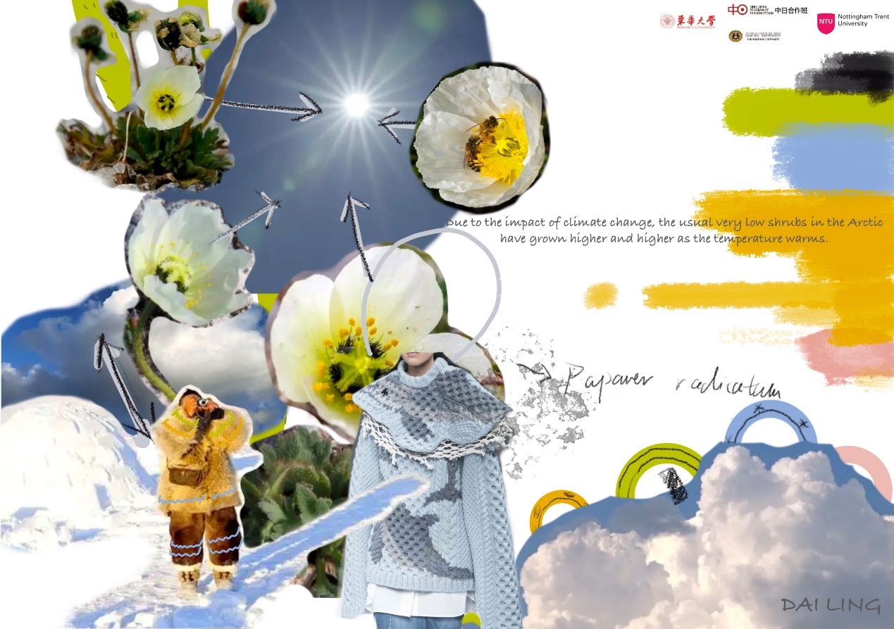 作品理念:因为气候的问题会像被推倒的多米诺骨牌一样,产生一系列连锁反应。气候变化引起的北极生态变化,激发我的主题“adversity life”。灵感来源于北极的北极罂粟和生活在那的因纽特人。北极罂粟的花语是向死而生,它生活在恶劣的环境中,但是对生命充满着热忱,从中提取服装作品中的主要颜色。我希望我的作品可以让人可以想到自然生命的顽强与美妙,关注气候变暖,思考如何更好地可持续发展,保护人们赖以生存的自然环境与资源,让人与自然更加和谐美好。
