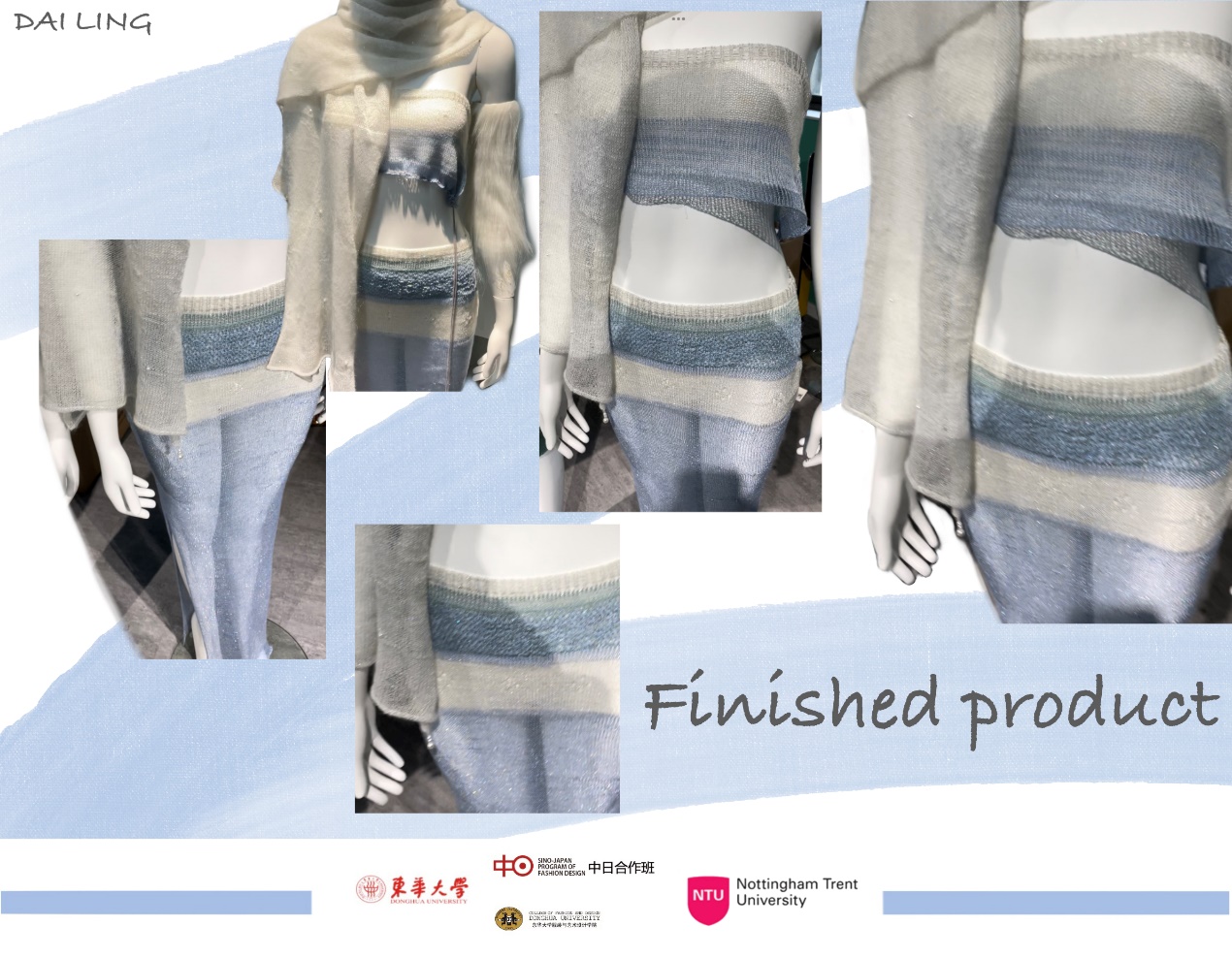 作品理念:呼吁人们重视环境保护和塑料污染。现代生活中,一次性塑料包装材料使用非常多,而一般塑料需要长达100-200年才能自然降解,这就造成了大面积的污染。我关注到以上现象,以此为灵感,选择了金银丝线和段染纱线。用蓝灰段染纱来表现海洋生态环境遭受破坏的情绪;提取了一次性吸管的型,使用管珠作为装饰;突出针织肌理的表达,最终制作成衣。