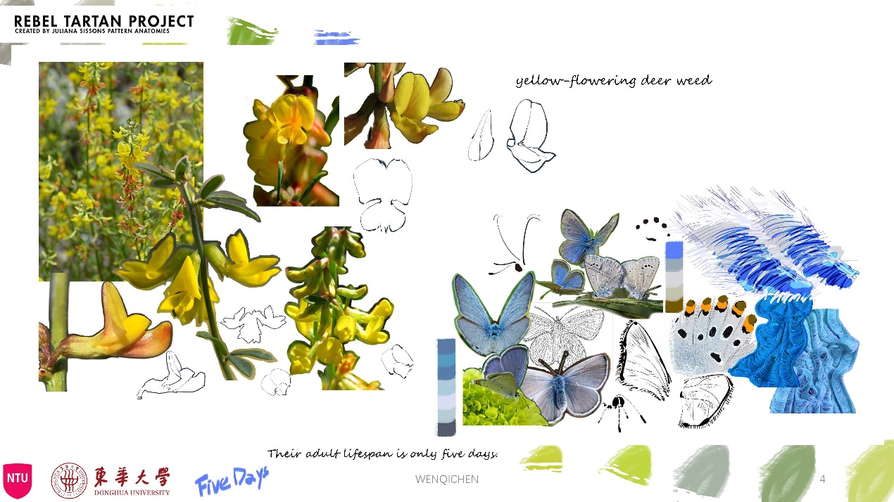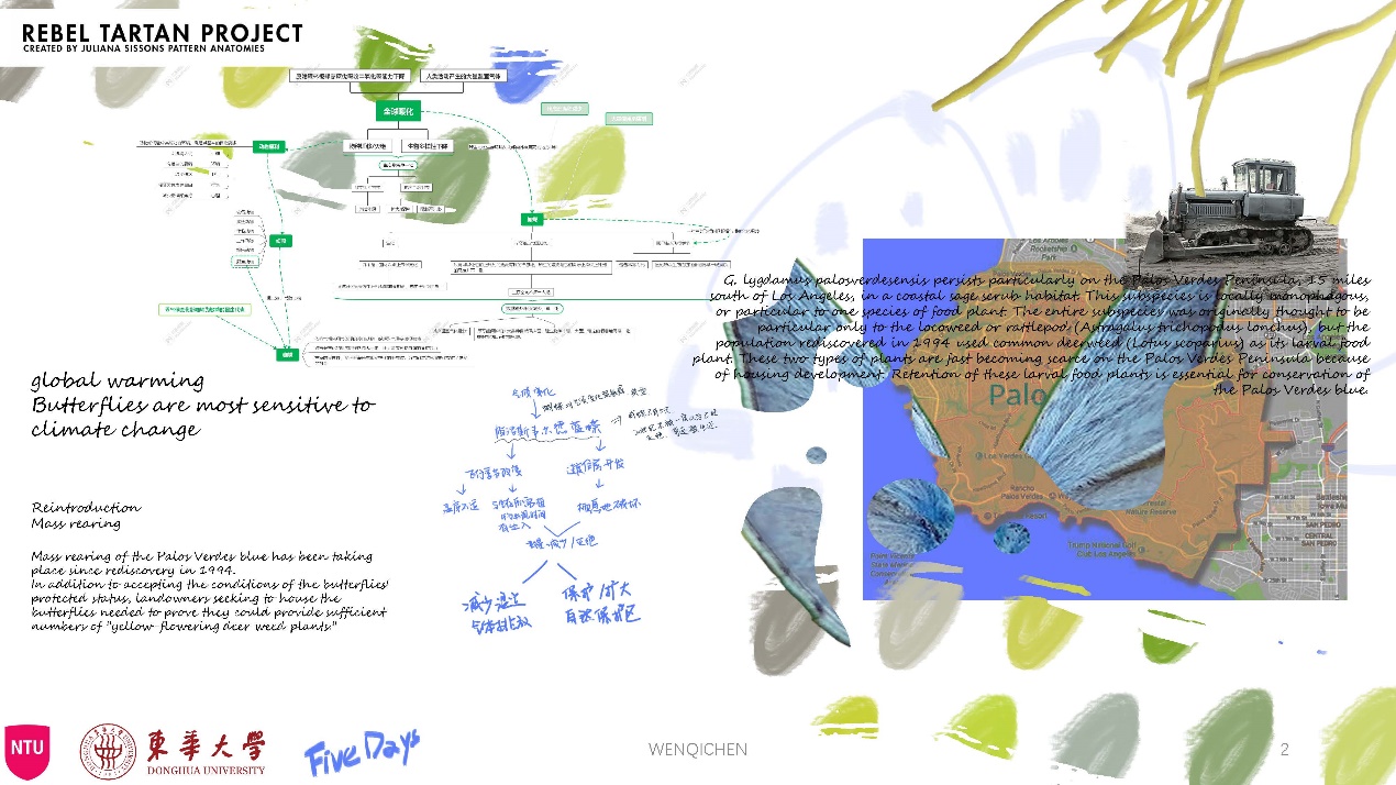 作品理念:全球暖化带来了物种的迁移和灭绝,小组围绕动物福利以“15-life on land”为主题,我们各自从一种陆生生物的角度从探讨气候变化与可持续的一系列相关问题。由于蝴蝶是对气候变化感知最为敏感的昆虫,我选择了曾经一度被认为已经灭绝的帕洛斯韦尔德蓝蝶作为我这一次项目探讨的生命。它们成蝶时间短暂却美丽,因此我发散并确定了自己的主题“5Days”。希望通过作品“5Days”使看到的人们发现这一美丽的生命,感受其美好,关注气候变化带来的不良影响,增加对可持续的思考,并能从身边小事入手促进可持续的发展。