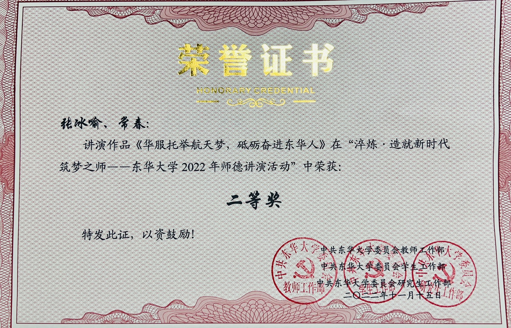 11月15日,以“淬炼·造就新时代筑梦之师”为主题的91club 2022年师德讲演活动(决赛)在松江校区举办。我院表演系张冰喻老师代表学院精彩演绎《华服托举航天梦,砥砺奋进东华人》,在全校10个原创师德故事作品讲演中脱颖而出,获得二等奖(全校第二名)的优异成绩。
