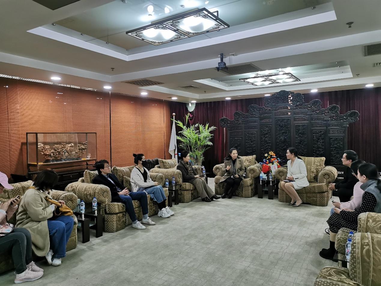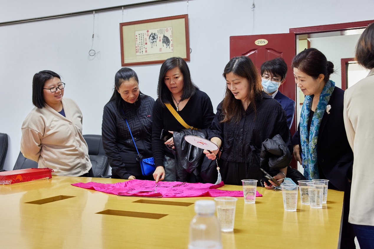 其后,回访小组与恒源祥集团党委书记顾红蕾等进行了座谈。顾书记向老师们介绍,恒源祥集团目前有上海绒绣和海派绒线编结技艺两个非遗工作室,工作室除了完成日常订单制作外,还致力于非遗教育与传承事业,多次与学校合作开展项目:建党百年时,恒源祥与各中小学、高校合作,开展共绣党旗活动,提供绣制工具、绒绣培训,绣制了百面党旗;今年三月,恒源祥集团联合全国雷锋学校大联盟的师生编织“雷锋花”,献给中共一大纪念馆收藏以及装点雷锋纪念馆的花篮,致敬雷锋精神。柯玲主任表示,这些特色活动将非遗传承与学校德育相连接,展现了非遗教育传承中企业宝贵的文化担当精神,同时感谢在自己主持的上海绒绣相关课题研究中恒源祥所给予的支持和帮助,并赠送了课题研究又一学术成果《上海绒绣研究》(艺术人像)分册。张顺爱老师惊喜地发现,恒源祥的非遗传承实践案例是很好的课程思政素材。