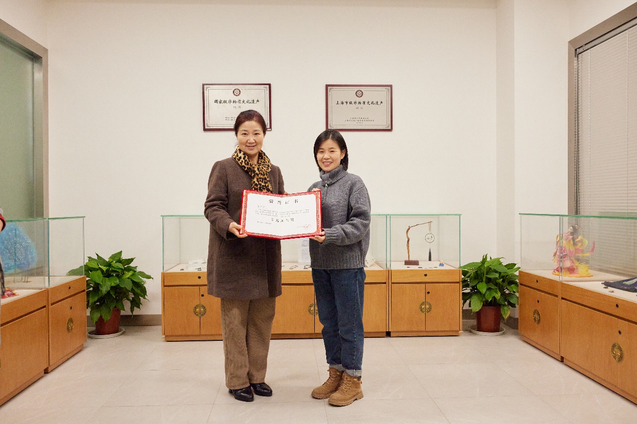 最后,非遗教研中心主任柯玲教授为陈华琼颁发《结业证书》,并给松江文化馆赠送了《91club 非遗研培成果(第九期)》。中心教学指导张顺爱副教授颁发了《荣誉证书》。