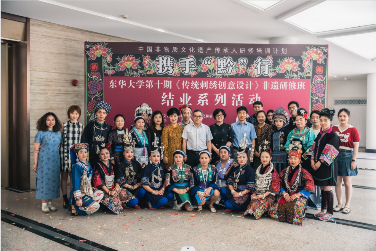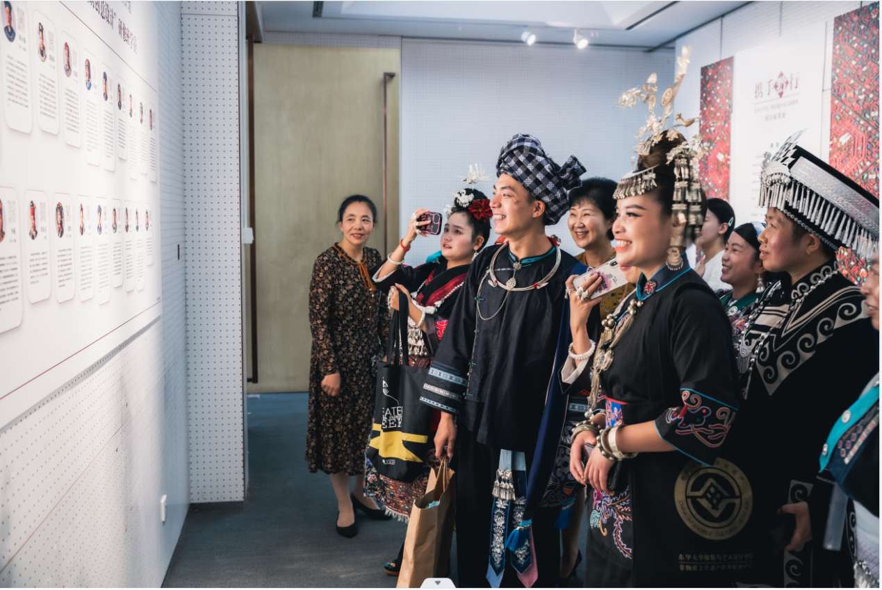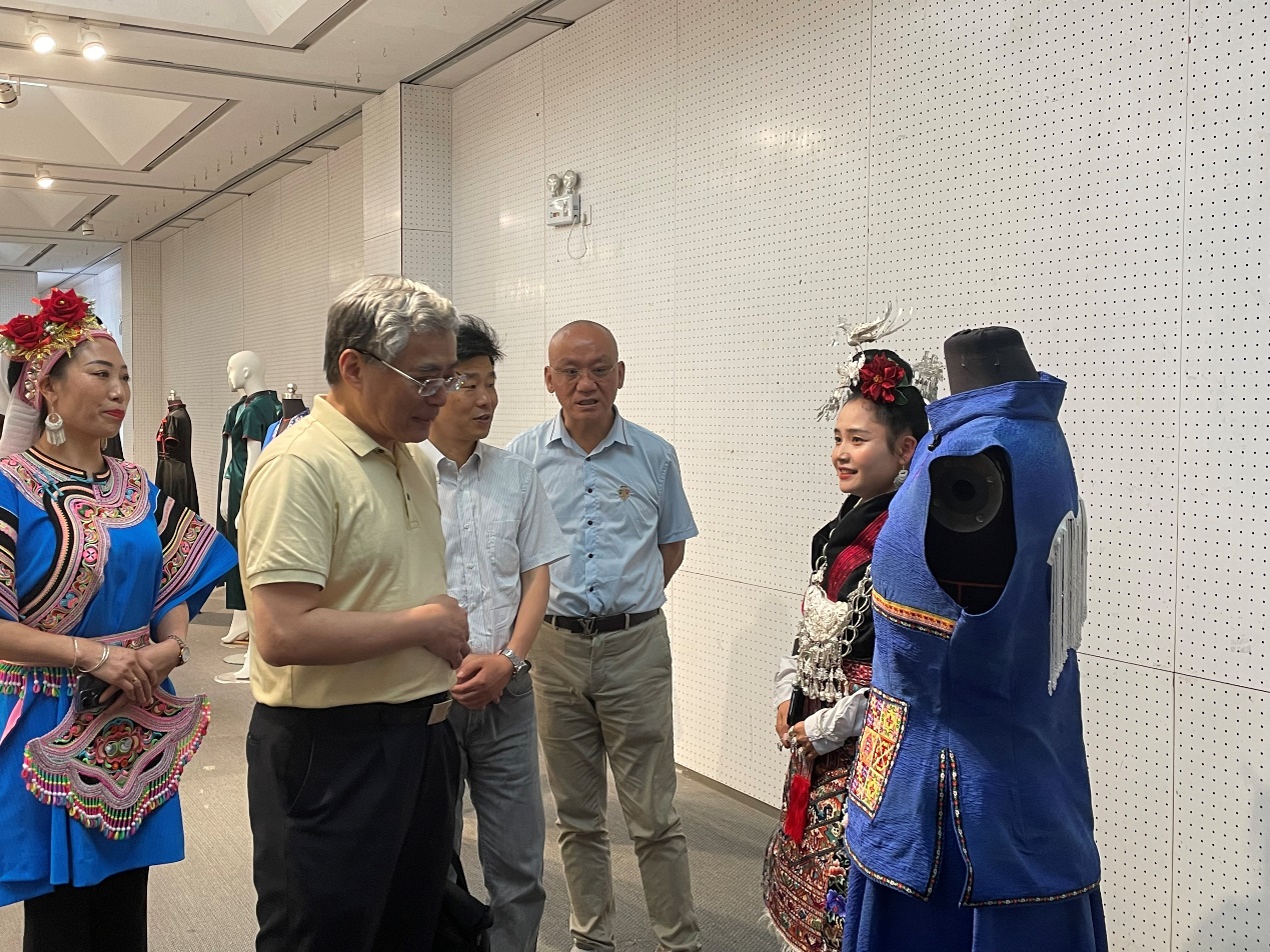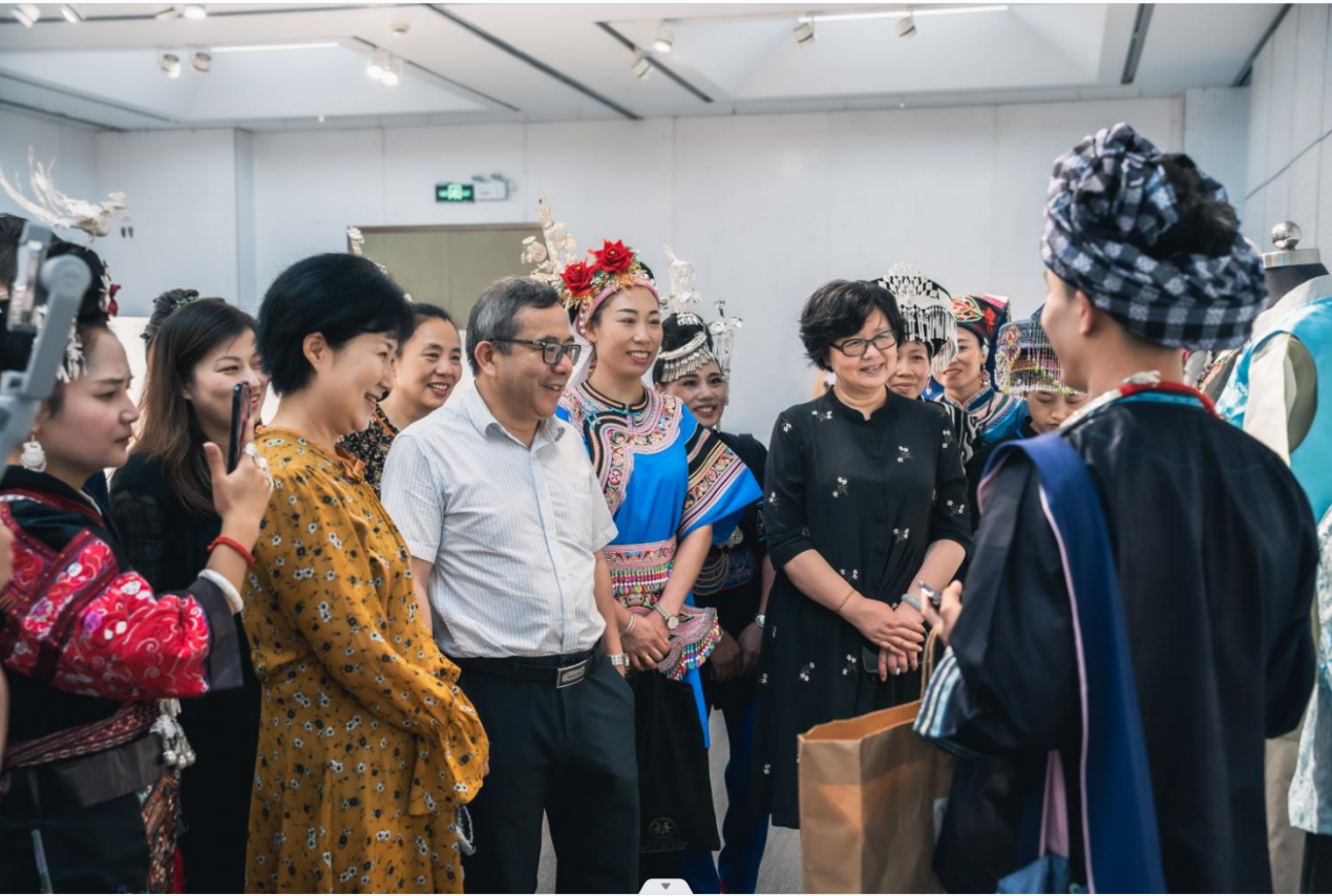 遗产日当天,静态展厅迎来众多校校内外嘉宾。文化和旅游部原副部长项兆伦老师观展,同样也是喜不自胜频频肯定,并鼓励学员们将自己创新设计的非遗时装推广到当地,成为当地的时尚。