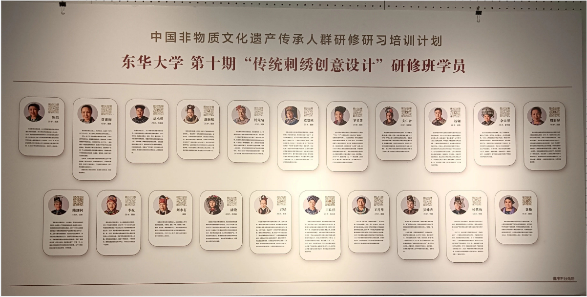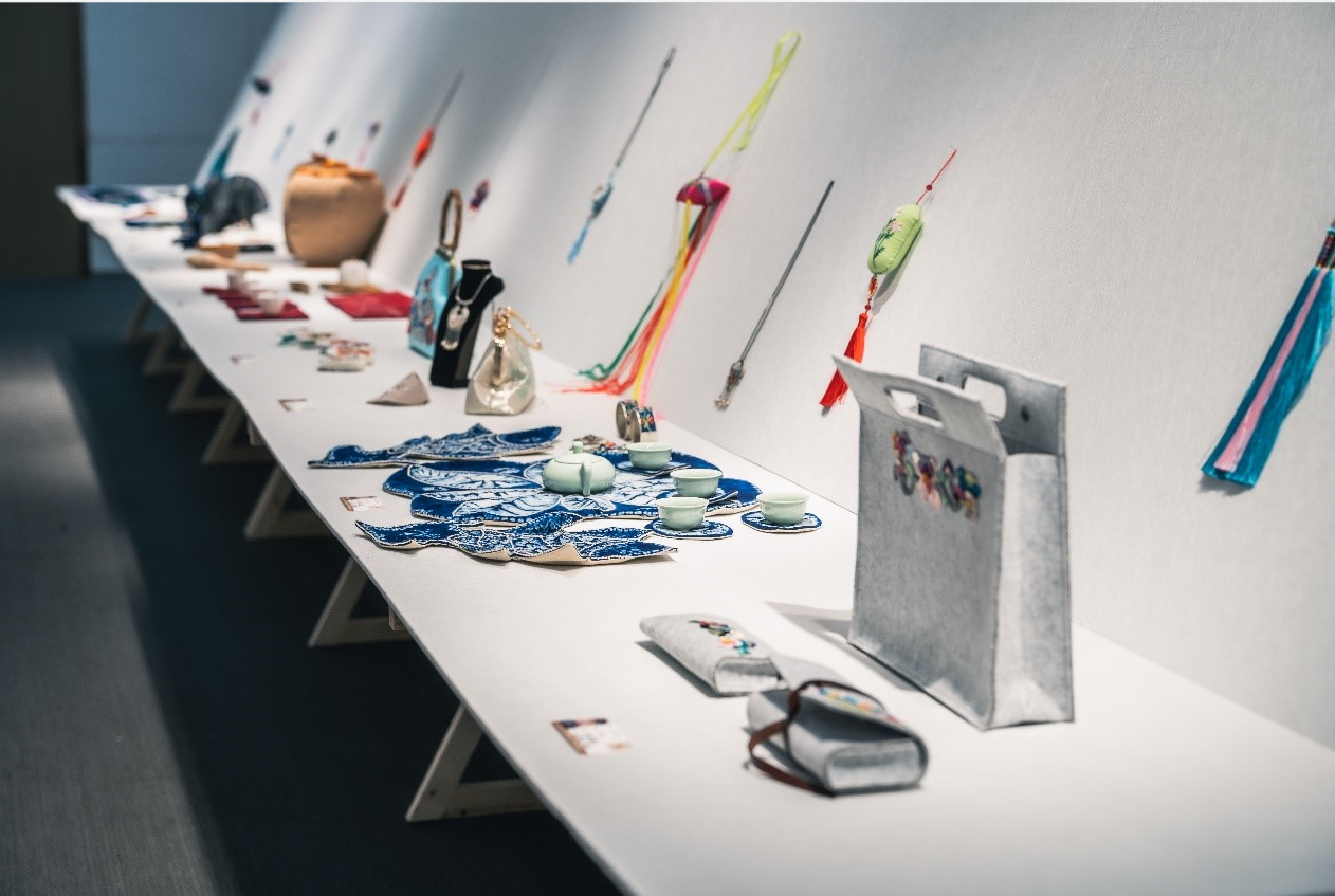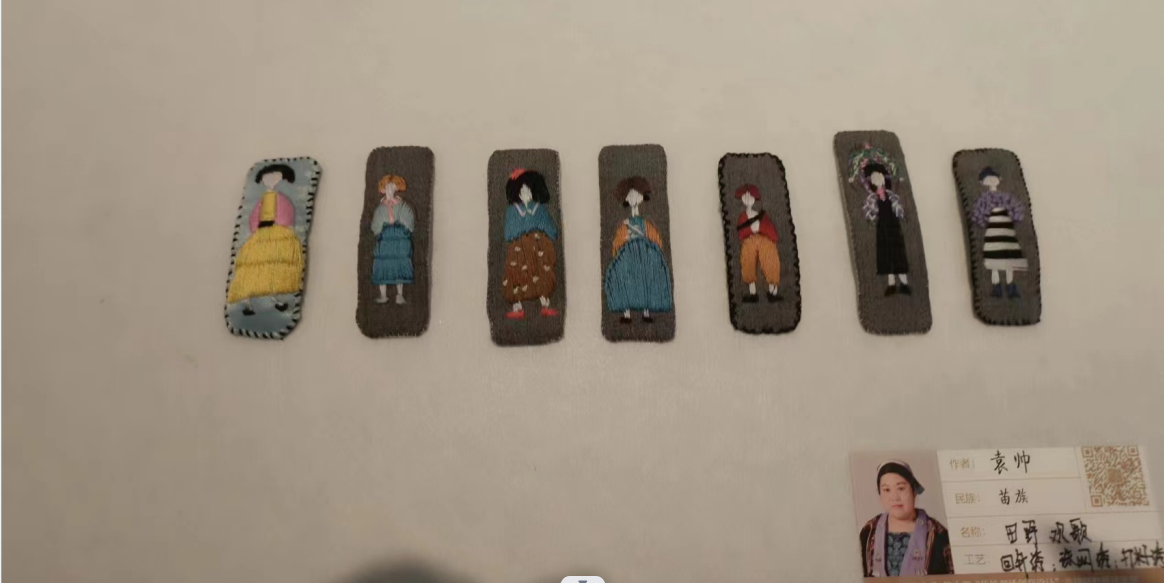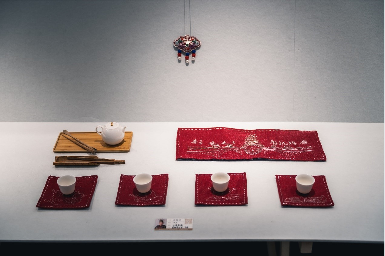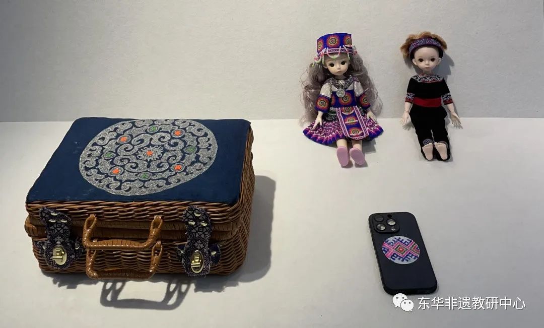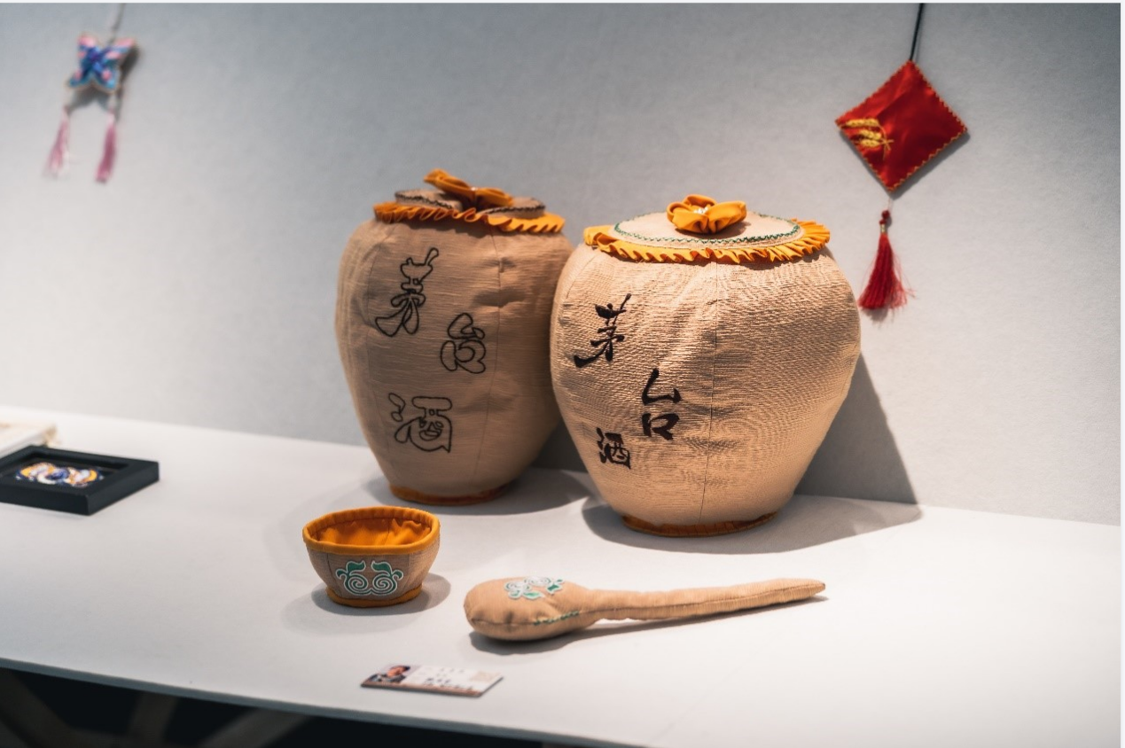 学员们的设计作品虽然以静态展呈现,但里面包含的情感却是流动的,背后蕴含的故事也鲜活而富感染力。文创作品中也充满了学员们的奇思妙想。学员杨翱为一家四口设计了礼物:妈妈的手机壳、女儿的娃娃和爸爸的手提箱,三个礼物上都使用了盘绣、蜡染、贴布等技艺;学员袁帅别出心裁地将研修班老师和助教们的形象都绣在了发卡上,她说希望用这种方式来感谢非遗中心老师和助教们对她的帮助;王月琴则用布艺和刺绣做了一套仿真“茅台酒”,从酒罐、酒杯到打酒葫芦一应俱全,观展嘉宾看到了都会心一笑;吴妹香的茶席5件套上用盘轴滚边绣绘出贵州锦屏的特色活动,她说要把家乡的文化留在上海、留在东华。