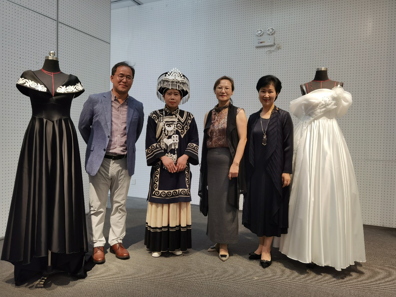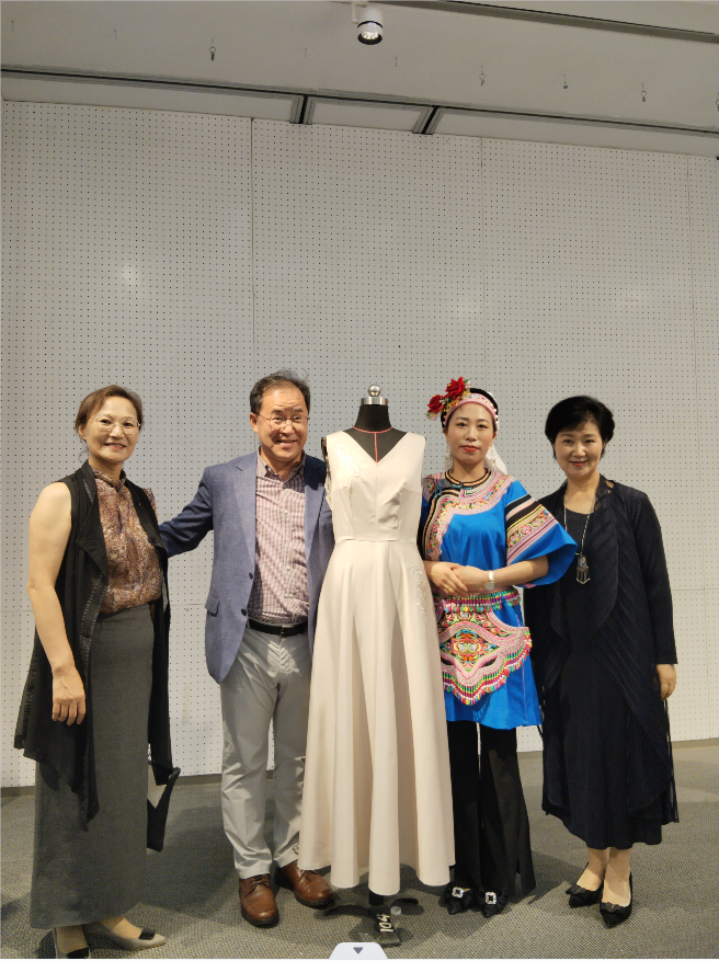 韩国纺织品中心R&D(上海)贸易有限公司理事长姜荣光、中国总经理李京任看到不少学员用自己公司赞助的面料设计制作的民族元素改良装既亲切又惊喜!纷纷拍照留念。