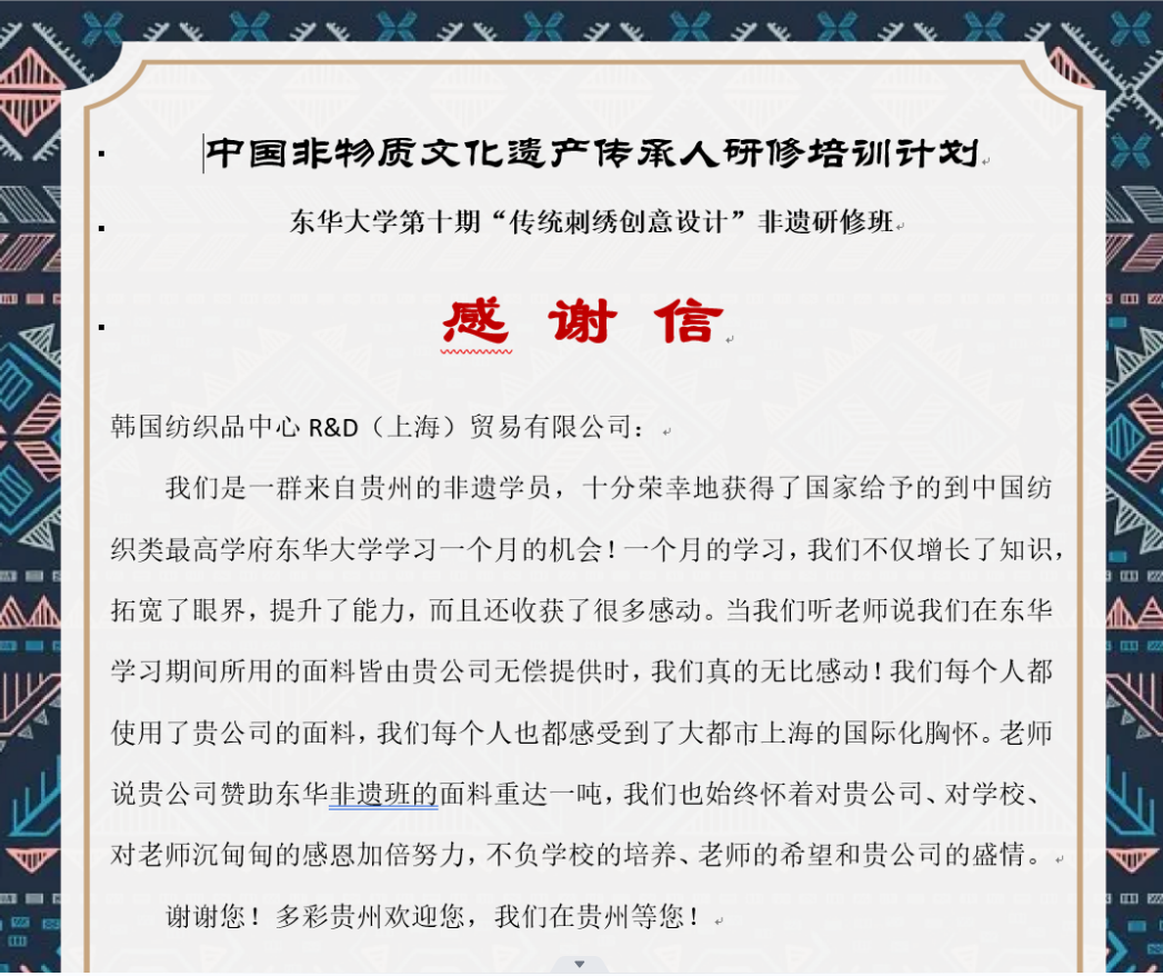 事实上,东华研培的国际化效应还远不止于此,教学指导张顺爱就是毕业于韩国高校服设专业博士,她的韩国友人在华经商,出于对中国传统文化的挚爱,主动赞助给了91club 重达一吨的进口服装面料。韩国纺织品中心(简称KTC)R&D(上海)贸易有限公司理事长姜荣光先生也应邀到现场看秀,学院党委书记吴晶代表学院亲自赠送给姜社长《感谢函》,并赠送一套结对设计时装作为纪念。本期研培班班长王良洪也代表学员上台给韩国友人献花、朗读了有所有非遗学员签名的《感谢信》。