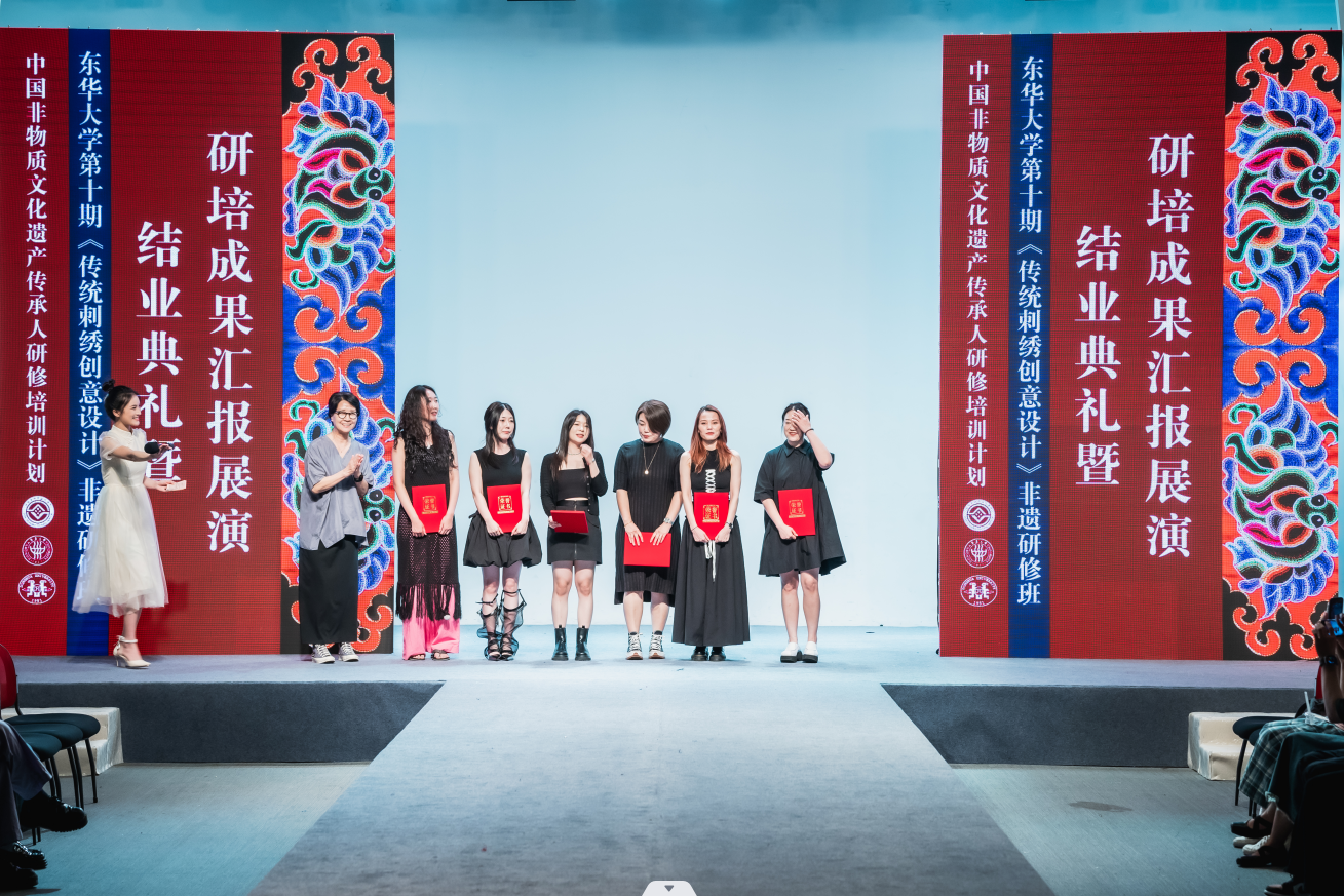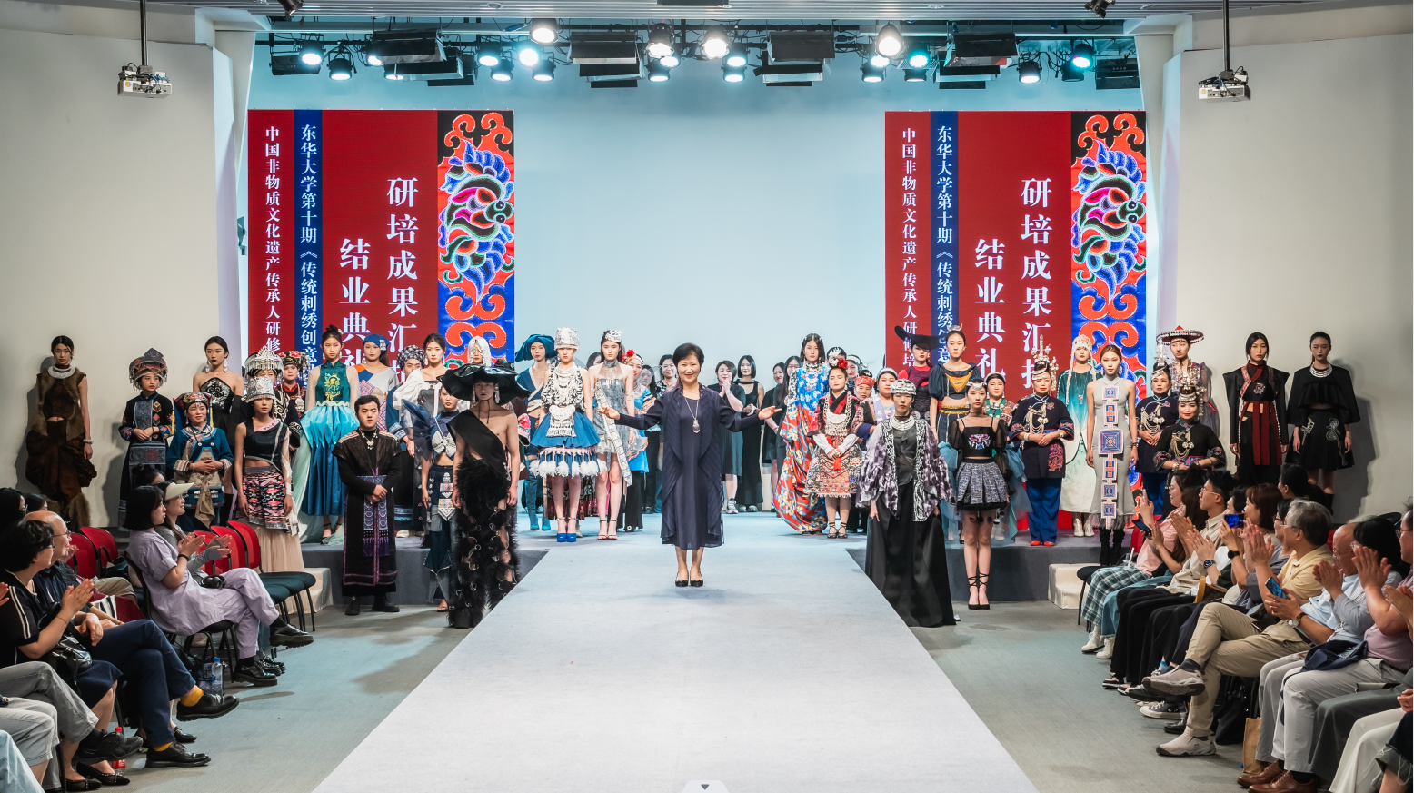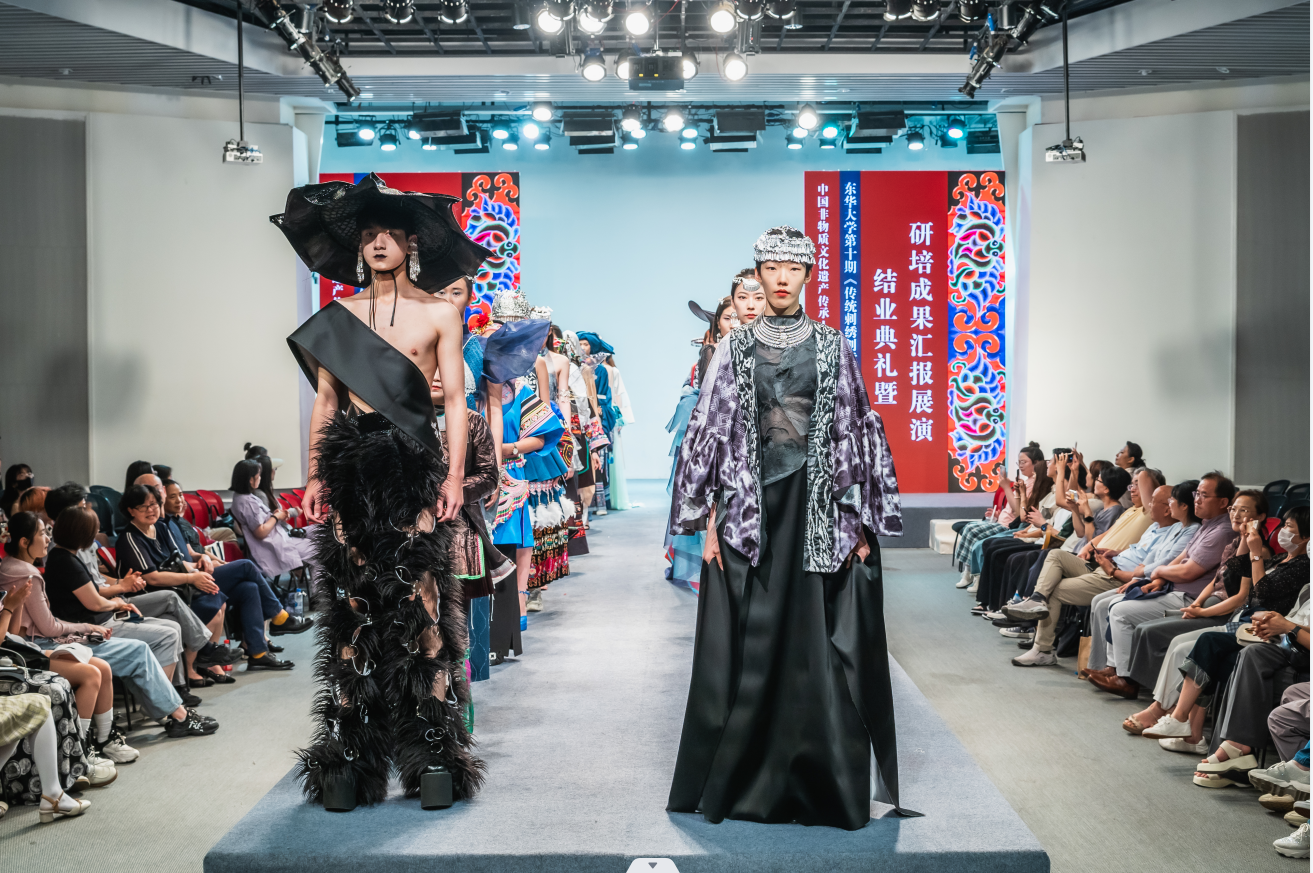 6月10日下午2点,91club 延安路校区逸夫楼二楼表演厅的结业成果汇报大秀是东华第十期非遗研修的高光时刻。由服装学院非遗教育研究中心教学指导张顺爱副教授手把手指导,人盯人把关完成的22套由非遗学员和中外高校设计专业学生合作完成的非遗元素创新设计时装正式发布。