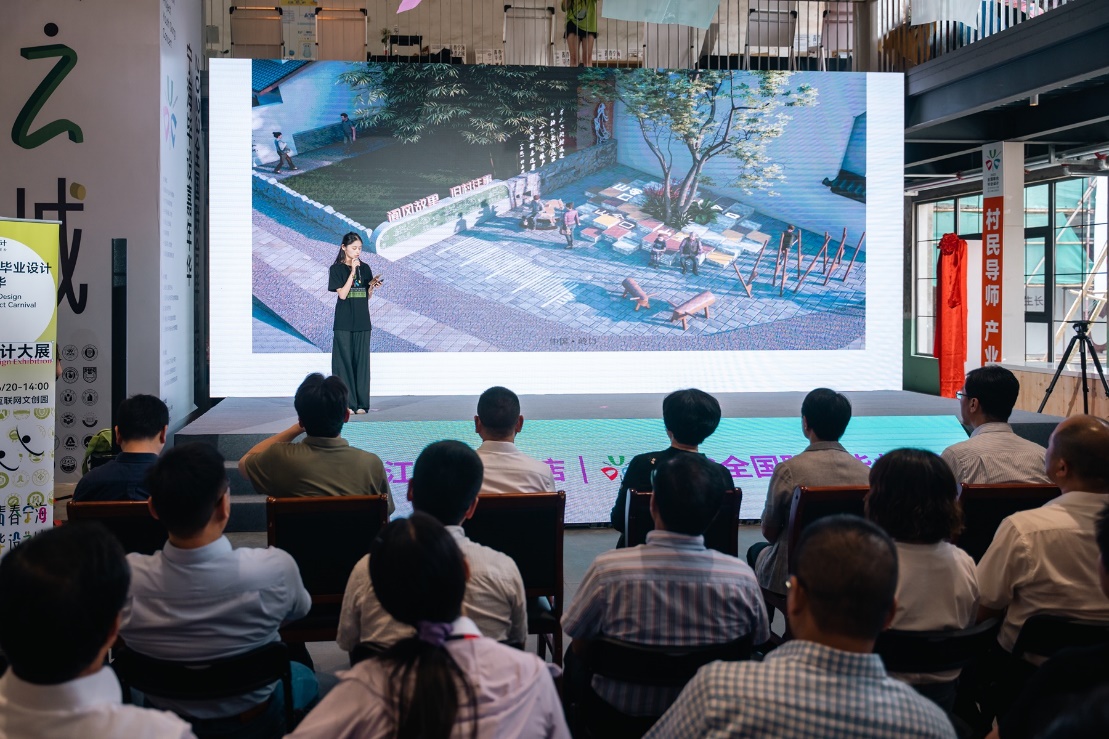 本次大展汇集了各高校艺术设计专业毕业生结合美丽乡村建设、产业创新、地域IP 等内容创作的毕业设计作品,参展学生及企业家、村干部代表进行了汇报交流。活动期间,刘承功还前往宁海县深甽镇柘坑戴村,走访调研东华学子围绕党建引领、乡村振兴、人居环境美化完成的暑期实践项目成果。