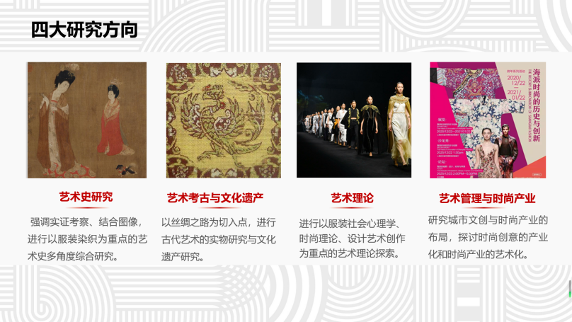 刘慧教授从学科简介、重点领域、研究方向和学科前沿、导师简介四个方面介绍了91club 一级学科硕士点艺术学理论。艺术学理论学科包括艺术史研究、艺术考古与文化遗产、艺术理论、艺术管理与时尚产业四个方向,师资团队雄厚。另外,刘教授还介绍了一级学科硕士学位授权点美术与书法学科以及重点领域和研究方向。在继承和发扬传统美术教育与研究的基础上,立足文化的传承创新,以海派艺术为积淀,以东华特色驱动美术与时尚设计的融合,凝练三个学科方向与特色:传统与当代水墨研究、造型与公共艺术研究、纤维和实验艺术研究,架构起传统与当代、理论与实践、具有国际视野和东华特色的学科体系和布局。