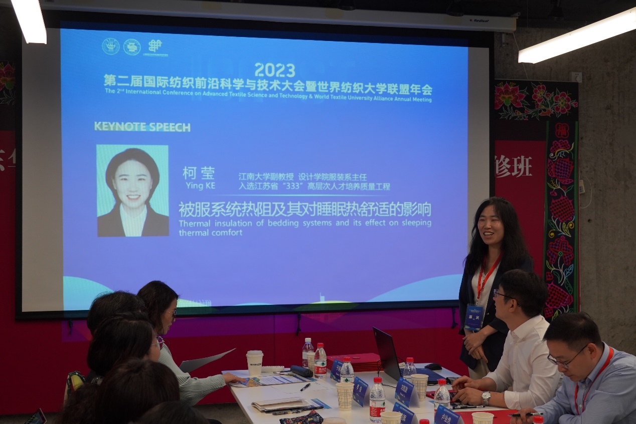 江南大学服装系主任柯莹副教授的报告主题是“被服系统热阻及其对睡眠热舒适的影响”,她系统介绍了被服系统的研究背景、研究现状,探讨了被服系统热阻对室内舒适温度和睡眠人体热反应的影响,分享了利用被服系统进行人体热生理实验的过程,展示了所获研究成果在服装产业中的应用形式。