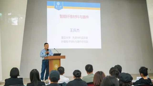 复旦大学先进材料实验室副研究员、博士生导师王兵杰分享了团队的研究成果。展示了储能、发光及显示织物的实验原型和应用场景,如储能纤维可以通过冲击、挤压织物产生电流为手机充电;可以织在服装袖口的作为导航使用的显示织物系统。这些研究成果令分享会观众大开眼界。此外,王兵杰研究员还介绍了纤维太阳能电池、纤维传感器纤维、纤维仿生人工肌肉等前沿研究。纤维电子材料和器件是一个多学科交叉的前沿领域,而纺织服装是其应用的一个重要出口。