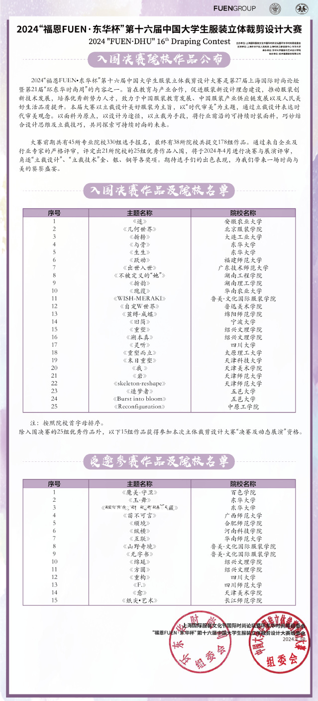 2024“福恩FUEN·东华杯”第十六届中国大学生服装立体裁剪设计大赛入围决赛院校作品公布