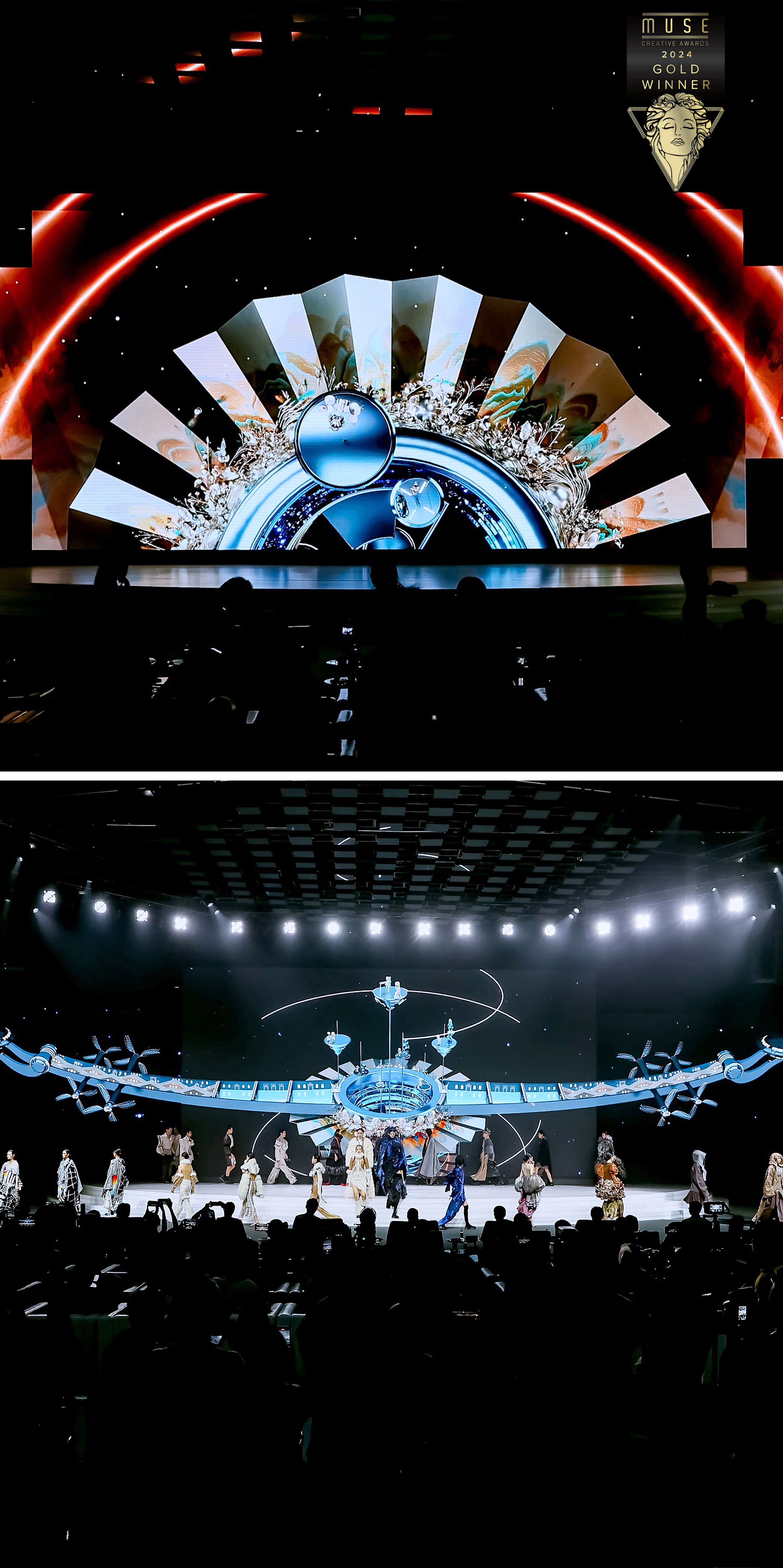 该作品由视觉传达系吴亮副教授领衔的视觉多媒体设计团队创作,曾为2023WDCC世界设计之都大会《衣尚东方》大型秀演的组成部分。创作团队以东方传统文化元素大胆重构了元宇宙式的秀演场景,将中国折扇、琵琶和引擎等元素组成了庞大的太空器——扇画琴舟。视频通过三维动画、AIGC、裸眼3D技术带领观众体验时空穿越,先后演绎出了动态千里江山图、鸾凤和鸣、江南园林、石库门和当代上海。在时装秀的背景部分,团队采用人工智能生成的巨幅动画同步呼应60余套真人秀演模特,体现出服装设计的灵感元素。作品通过现场震撼的视听体验,虚实融合地映衬了服装作品的表演,并向全球直播,为线上线下观众带来了一场融合数字艺术的时尚盛宴。