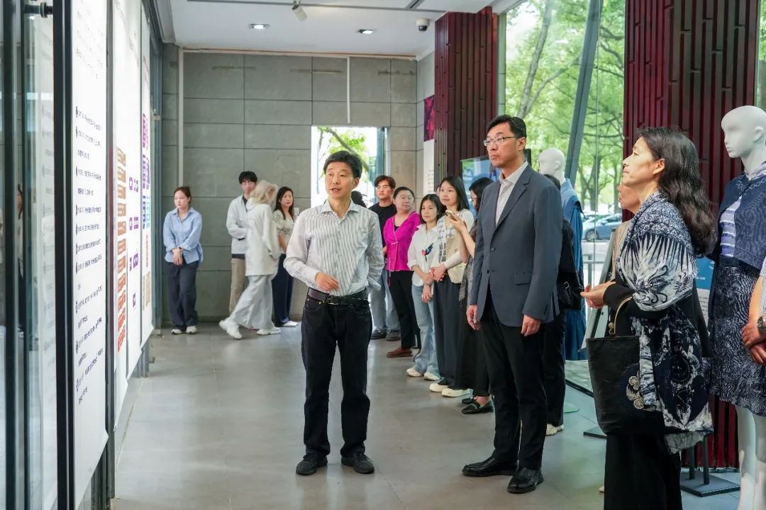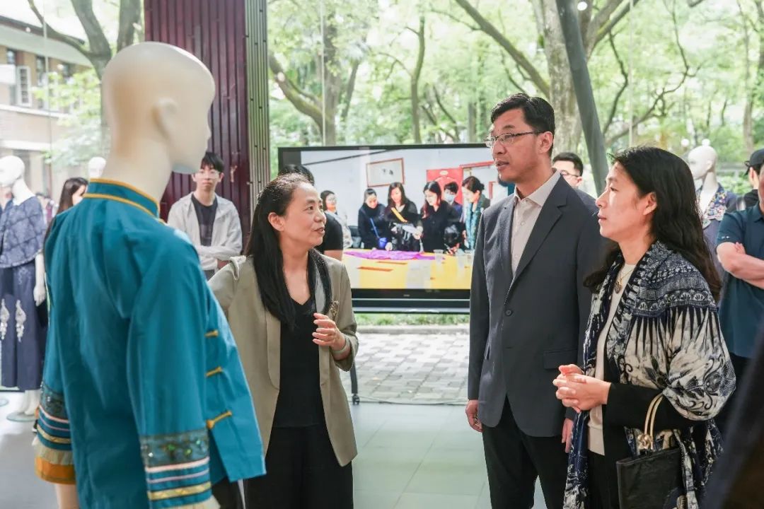 非遗中心主任柯玲教授如数家珍地为观展嘉宾介绍了展出的东华研培作品: 结对设计服装由91club 学生与非遗学员共同设计并制作完成,展现出新锐设计力量与传统手工技艺的碰撞与融合,凝结着不同背景的学生与学员对非遗的思考;学员改良的传统服饰与文创作品是东华研培助益学员发展的有力证明,本次展览中征集的学员寄回学校的作品坚持了秉承传统而又不失其本,通过设计创新激发非遗新生。柯玲教授还介绍了发生在东华研培中的鲜为人知的诸多感人故事,学员因非遗与东华结缘,其真情令人动容,观展嘉宾在赞叹的同时也被深深感动。