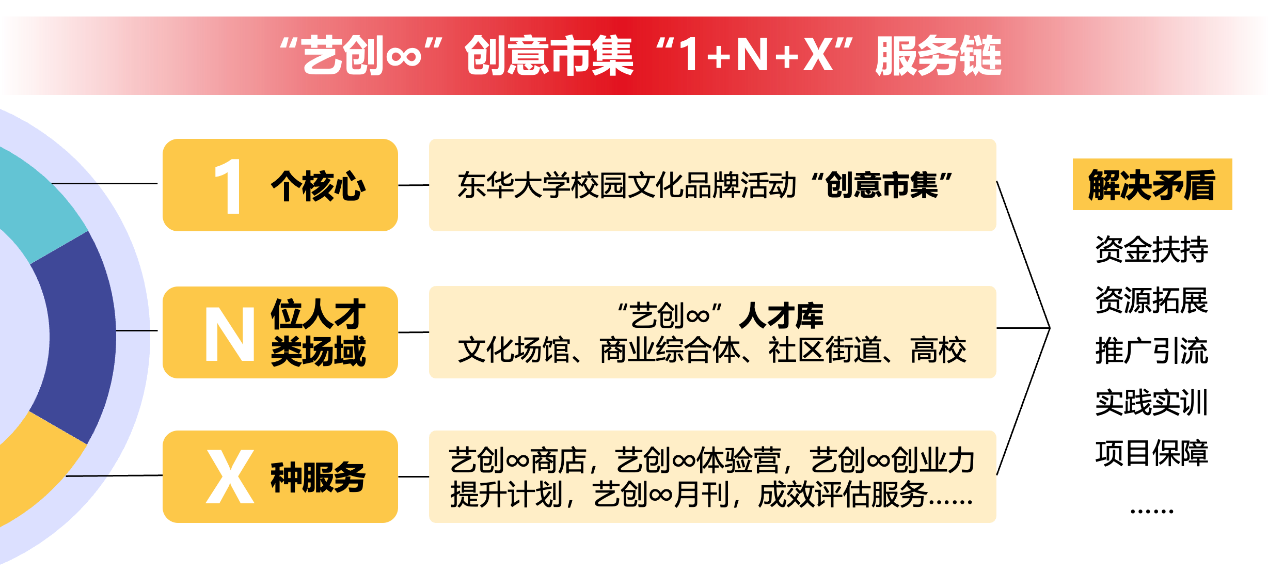为进一步促进以创业带动就业,发挥就业育人实效,艺创∞平台着眼于广大艺术类青年大学生,为有意向从事艺术类创业的青年提供从孵化、转化再到深化的三级进阶式创业服务。平台以“1+N+X”为服务思路,从“1”个核心,即连续15年举办的91club 校园文化品牌活动“创意市集”出发,搭建具有“N”位人才的艺创∞人才库,结合文化场馆等“N”场域的外部资源,开展如艺创∞商店、艺创∞体验营、艺创∞创业力提升计划、艺创∞月刊等“X”类创业服务,并定期通过成效评估检验平台服务效能与品牌发展情况,助力青年大学生创新培养与创业孵化走深走实,让青年人才更有力量,让青年设计更有声量。