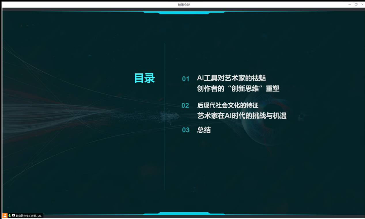 视觉传达系李雪飞老师作为数字媒体方向的研究者,为同学们介绍了AI时代下艺术家面对的祛魅和创作表达,分享了学科前沿的技术现状与应对方式。李老师通过AI工具时代下创作者的“创新思维”重塑,以及艺术家在AI时代下的挑战和机遇两个板块,运用了音乐、游戏、影像以及虚拟数字艺术等多种案例进行了生动的讲解。