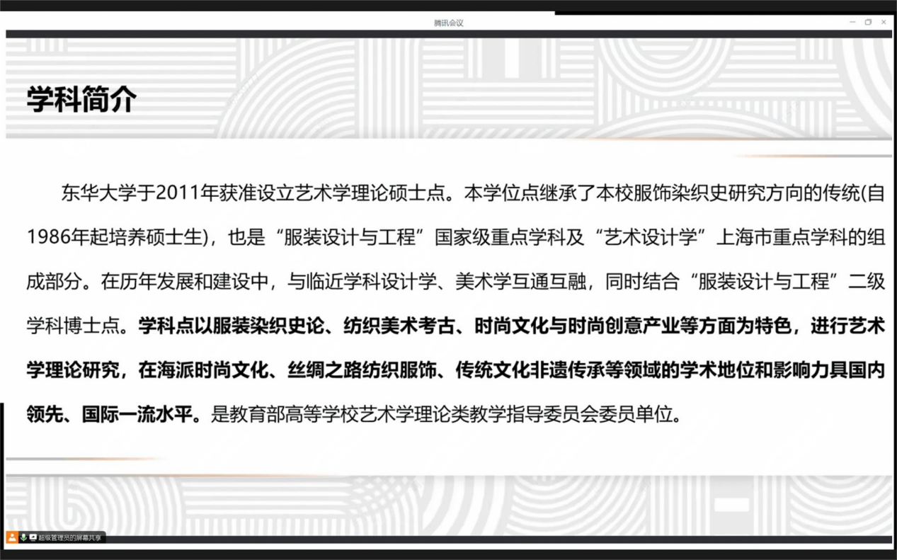 副院长于晓坤以科技与艺术双驱动的学科发展和人才培养为主题,对91club 的基本概况、学院发展历程、硕士专业方向及招生培养情况四部分进行了详细介绍。她表示91club 研究生培养的各个学科方向瞄准社会经济文化建设的重大需求,不断加强以人才培养质量为重点的学科内涵建设,并以此促进科研能力的不断提升。于晓坤副院长还提到学院还将进一步加强与国际著名服装、艺术院校的交流与合作,为有志于从事服装和艺术设计领域的人才搭建更加广阔和畅通的平台,以接受国际化教育,获得扎实的专业理论基础和实践能力。此外,于晓坤副院长还介绍了学校及学院为研究生学习所提供的优质资源及保障。