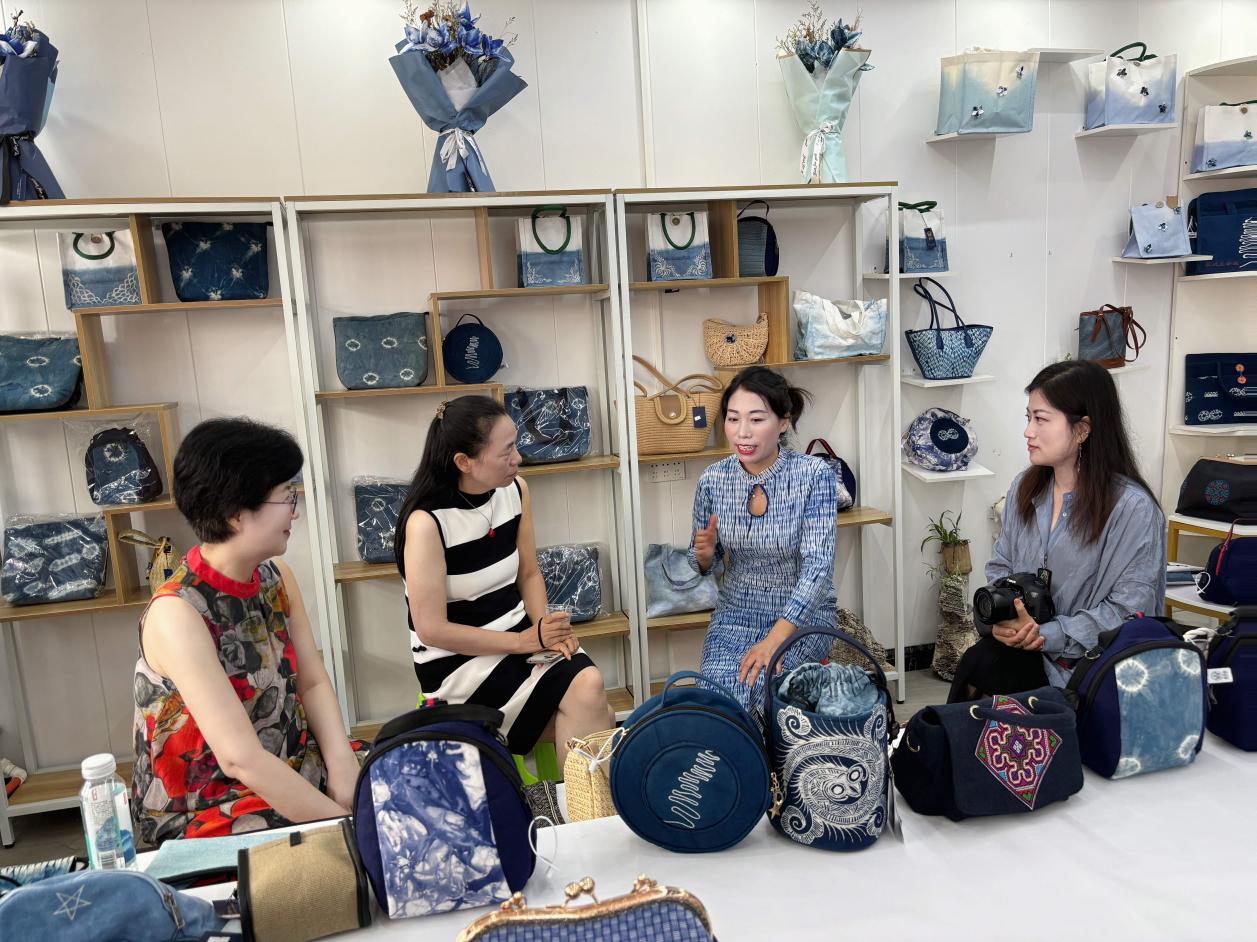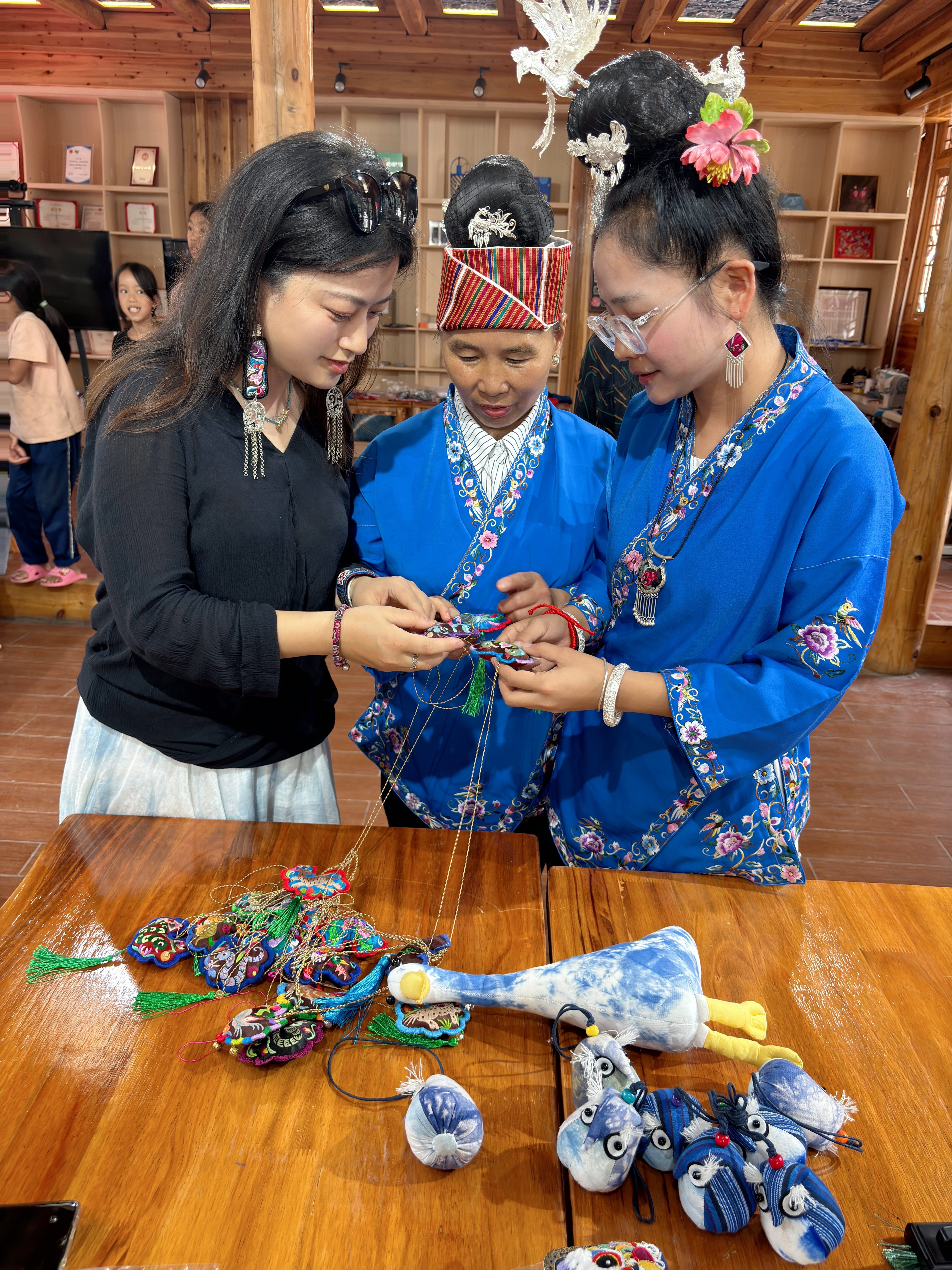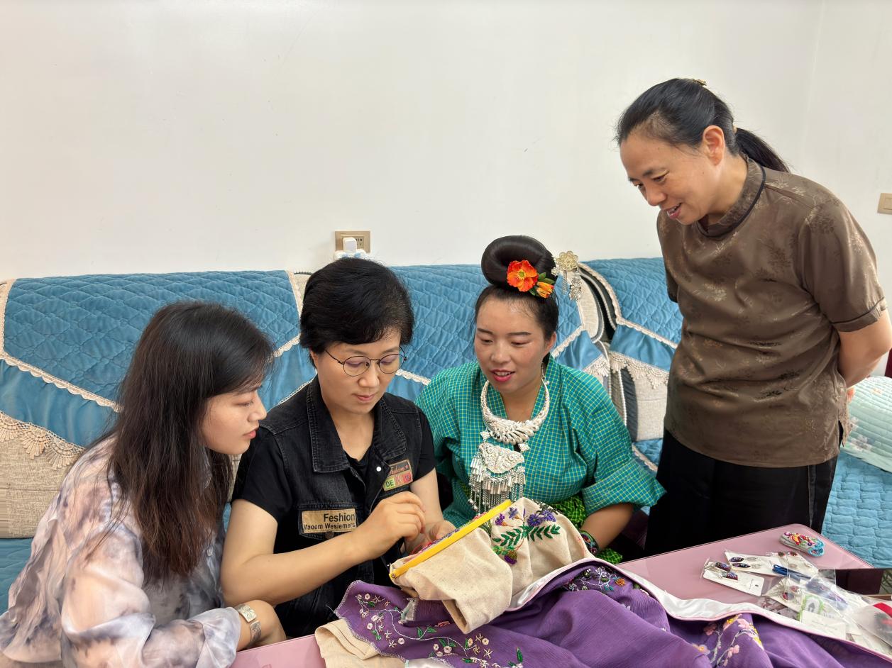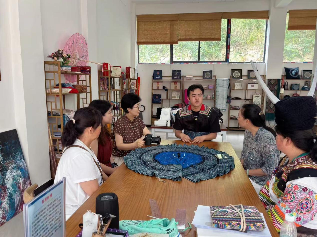 东华学员之间互爱互助,在创新发展中彰显“研培合力”。东华研培倡导的“一朝研培 终身互助”精神不仅表现在师生之间,也体现在学员之间。本次回访的第九、第十期学员全部来自贵州。同一区县的学员之间携手实现优势互补、各展所长。而异地的贵州东华学员间同样关系紧密,突出表现在文创产品设计和信息交流更新速度快等方面。学员沈龙菊参培后迅速将自己的文创店铺从1.0升级至2.0,因为产品供不应求正积极准备再升级。她的文创产品在其他学员处也有分销。学员周彩萍透露东华同学联系非常紧密,设计巧思、市场动向、原料品质甚至渠道都会及时分享,几乎天天都有互动。第十期学员杨翱一向乐于助人,他精于机修,自然而然成为大家的“顾问”。在同城李祝的公司里见到了杨翱公司的绣片……回访老师听后深感欣慰,非遗传承需要合力。