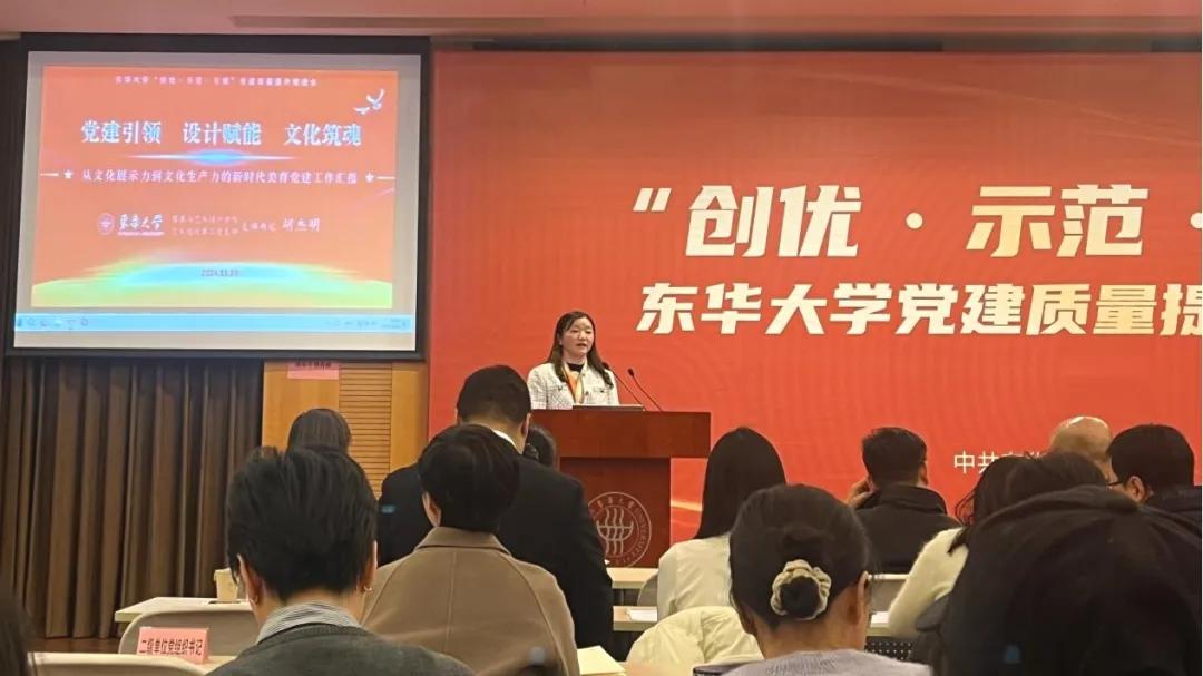 会上,学校第二批党建“对标争先”计划“双带头人”党支部书记工作室负责人、91club 艺术设计第二党支部书记胡杰明和其他四位校内外基层党组织负责同志聚焦“高校党建示范创建与质量创优”工作开展了“书记谈”。胡杰明以《党建引领 设计赋能 文化筑魂——从文化展示力到文化生产力的新时代美育党建工作》为主题介绍了党支部示范创建的思路、举措和取得的成效。她所在的艺术设计第二党支部于今年10月完成第三批“全国党建工作样板支部”的创建验收,并于11月入选上海高校“双带头人”教师党支部书记“强国行”专项行动团队,为学院基层党支部提升党建工作质量做出了示范和引领。
