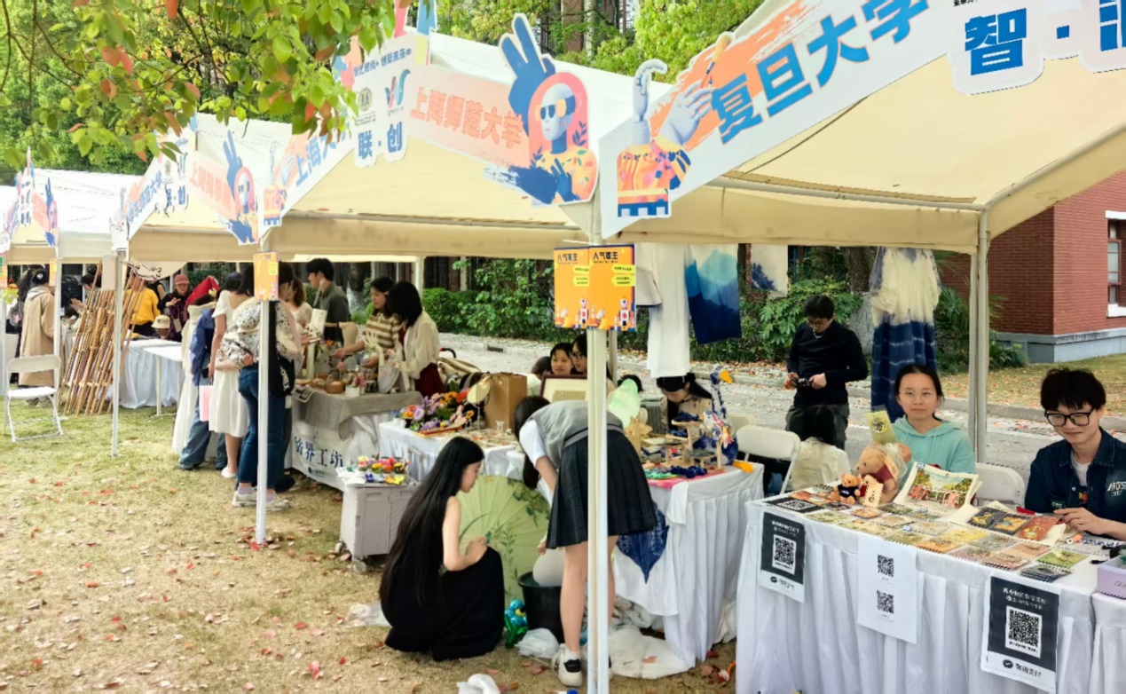 本届创意市集为创意共同体建设搭建了校级联动平台。由91club 牵头的服饰文化育人联盟自成立以来,始终致力于推动中华优秀传统文化与服饰文化的守正创新,促进文化交流。复旦大学、华东师范大学、上海大学、上海师范大学、上海商学院、上海工艺美术职业学院等联盟高校创意团队入驻,形成“联·创”板块,各成员高校汇智聚力,共同促成沪上青年跨校创意的生动对话。
