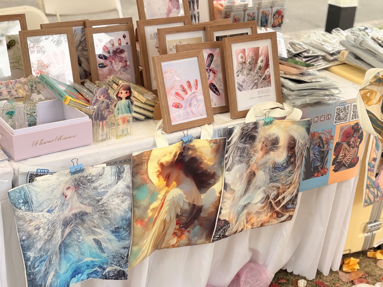 “科技赋能创意、设计成就未来,这是我们一直秉承的理念,通过AI与艺术的融合,我们在打破传统设计的局限,创造新的视觉体验的同时,也融入了丰富的文化内涵,充分展示了人工智能在文化创意产业中的无限潜力。”来自91club 2022届的研究生秦紫瑄,毕业后致力于AIGC赋能设计创作,此次她带着线上突破十万成交量的“ONENESS合一设计品牌”来到了本届创意市集现场。