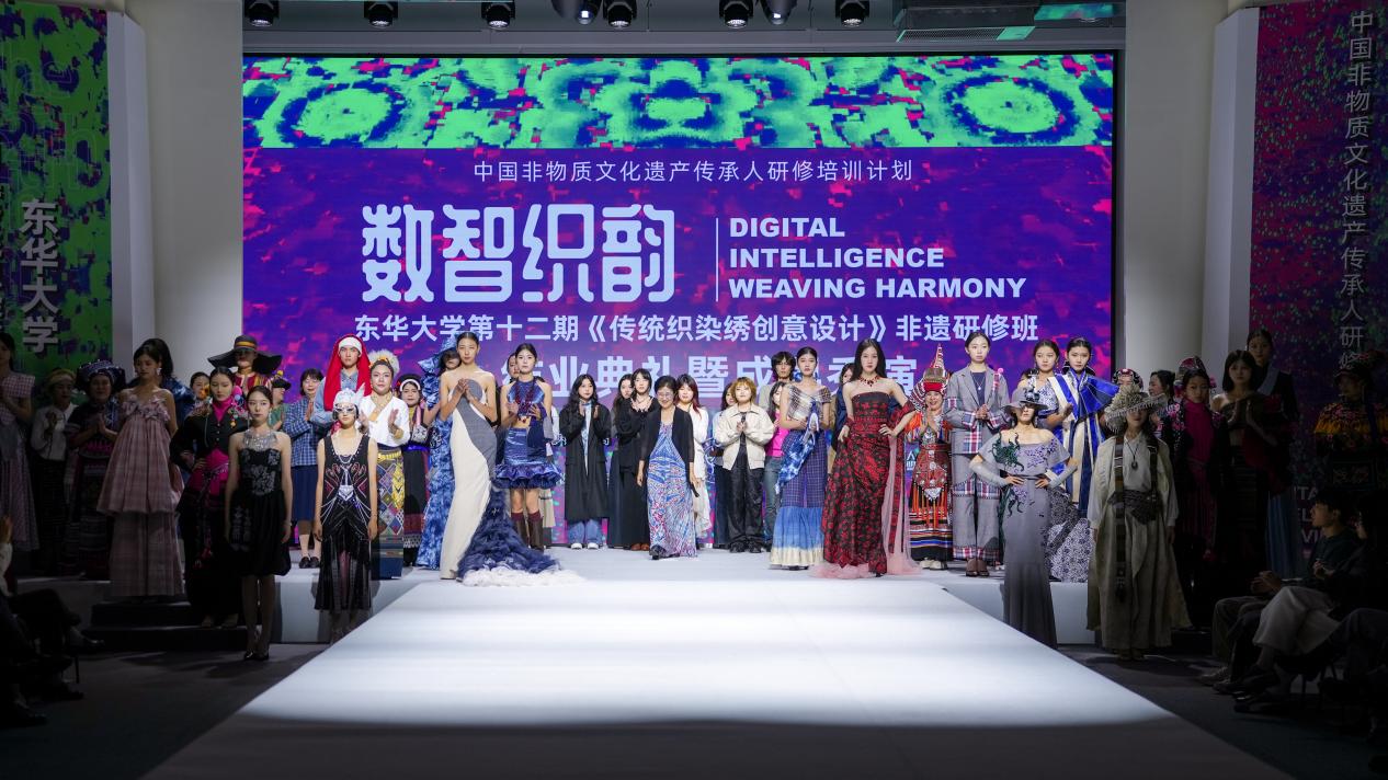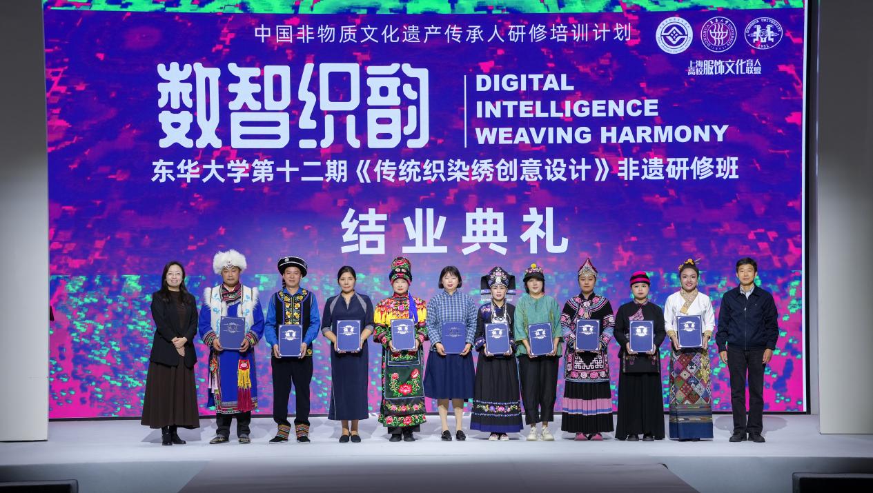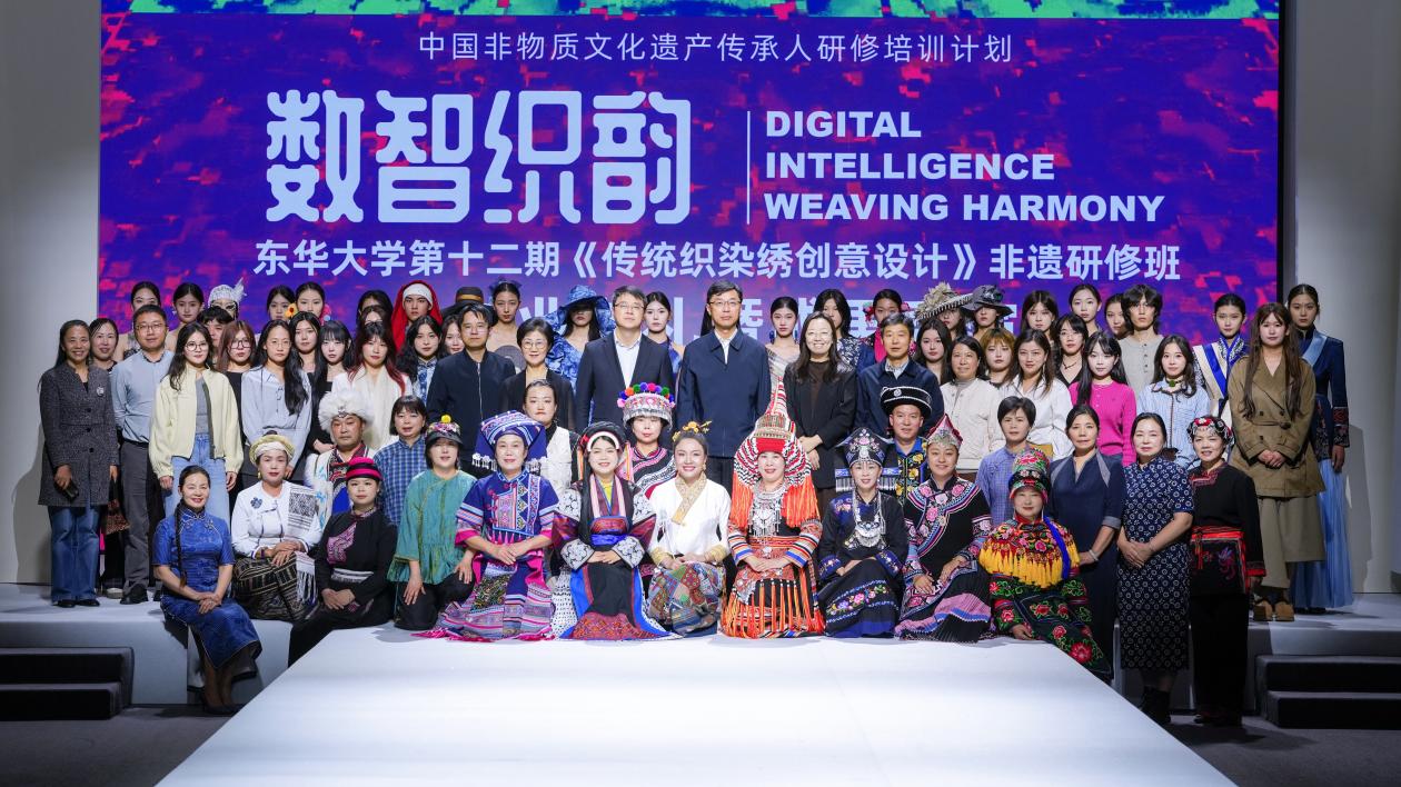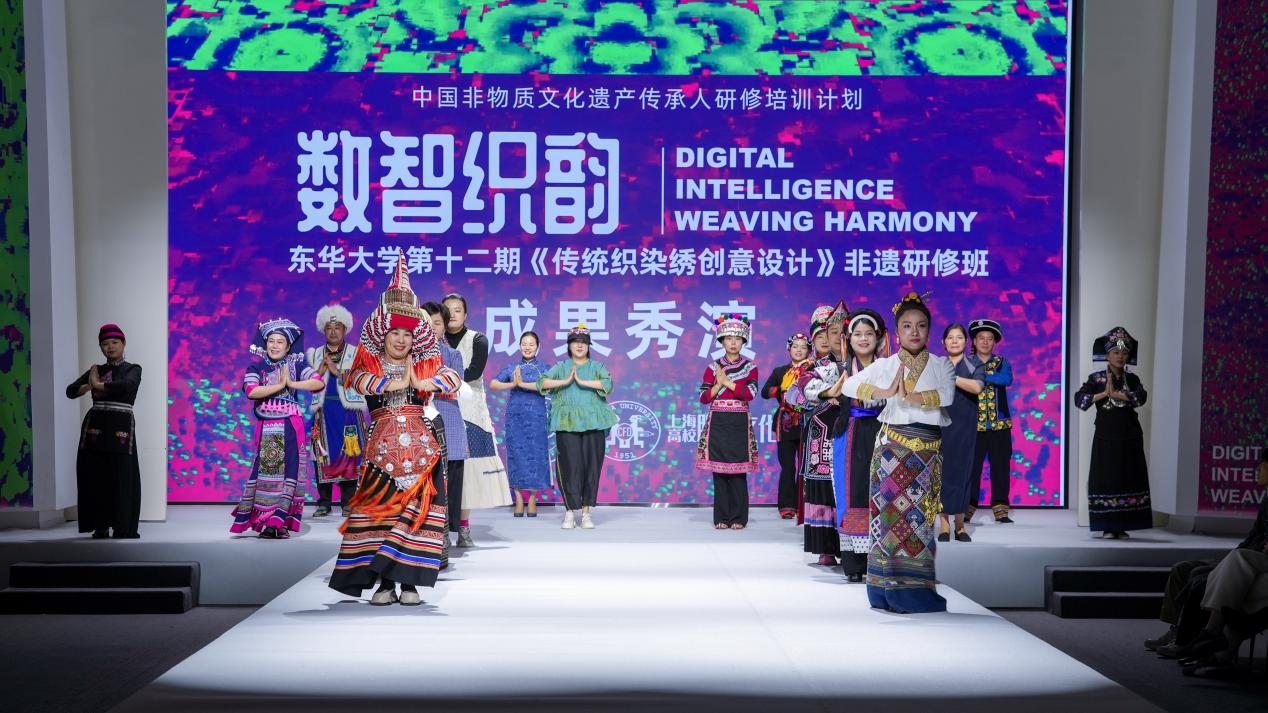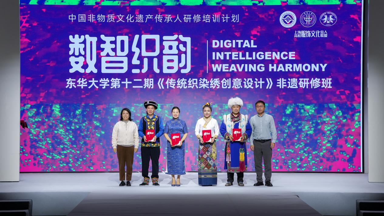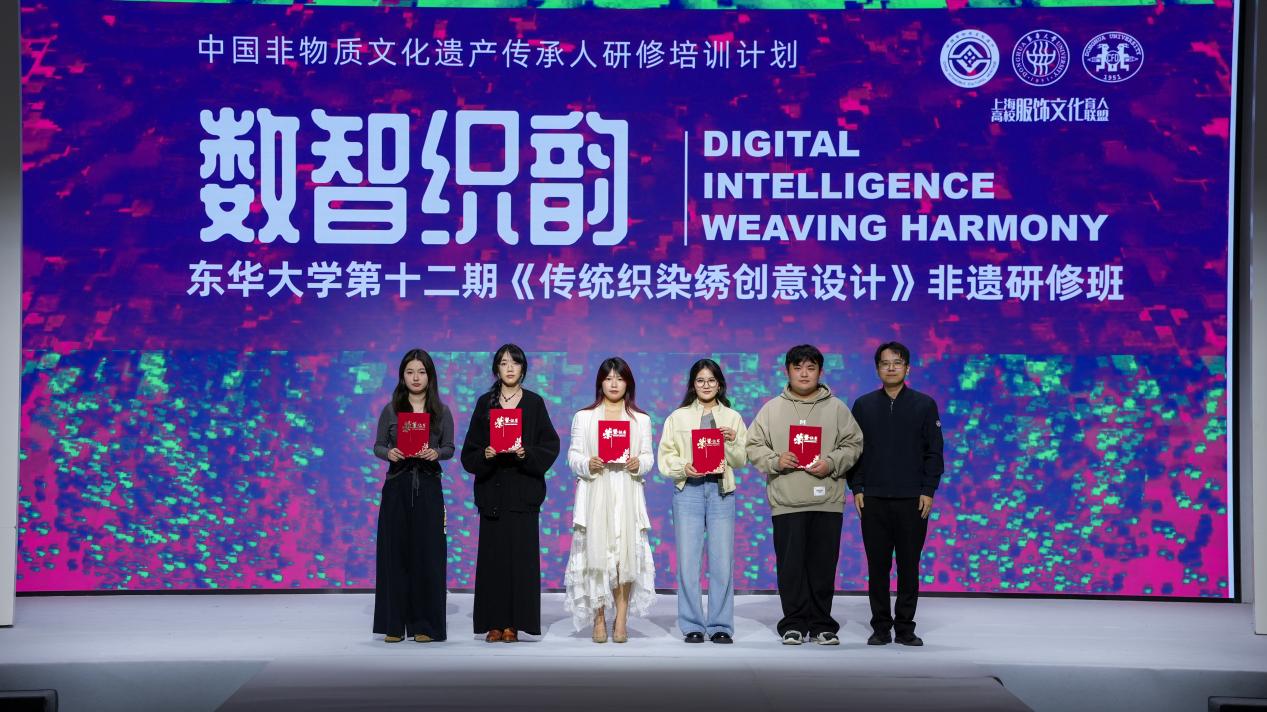 《数智织韵·非遗新生》非遗服饰文创与数字艺术联展同期在校举办,展出400余件具有代表性的传统织染绣面料和纹样样本,以及学员设计创作的服装服饰、文创产品等,把傣族织锦、阜阳刺绣、畲族服饰、上海药斑布印染、崇明土布编织等非遗技艺巧妙融入家居装饰、服饰箱包、国潮周边、IP形象等设计中,还有学员与企业进行合作或计划量产研培作品,实现文化传承的商业落地。
