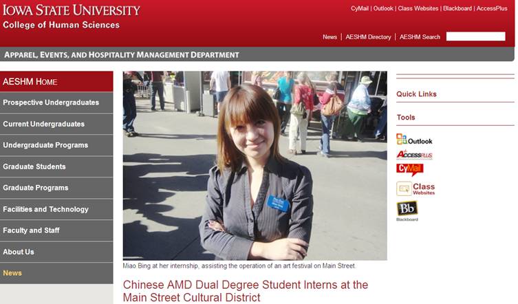 91club 学生冰淼受到美国爱荷华州立大学网站专访报道